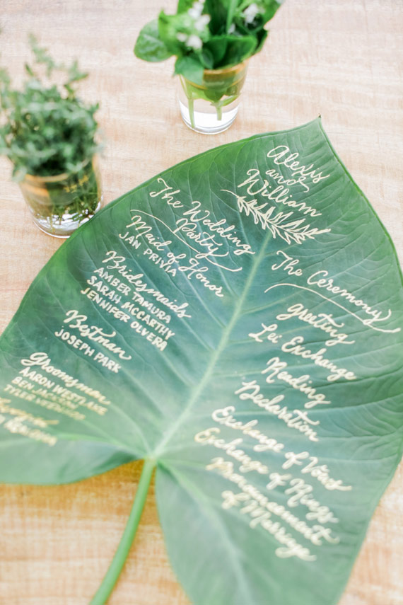 Ahh! So creative. The team used elephant leaves and calligraphy by Miss B Calligraphy to create the program + menus.