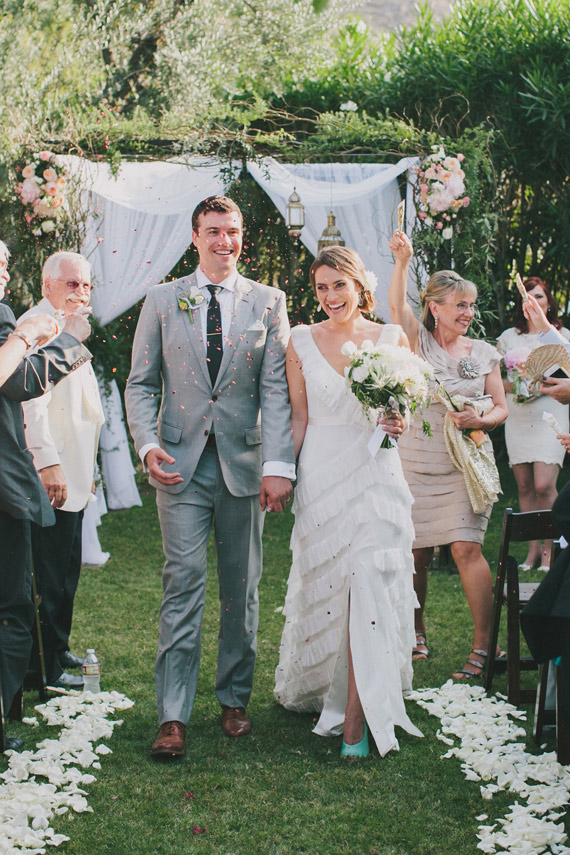 Photographer: Fondly Forever Photography / Venue: El Cielo Estate / Event Coordinator: Twine Events / Event Design: Bride Rachel of One Part Gypsy / Personal + Chuppah Florals: Madison Workshop West: / Tabletop Florals: One Part Gypsy / Hair: Allison Zarrabi of Shear Insanity Salon / Makeup: My Girls on Film Studios / Invitation Designer: One Part Gypsy / Cake: Jamaica’s Cakes / Catering: EAT Marketplace & Catering / Rentals: Signature Party Rentals, Sweet Emilia Jane, & One Part Gypsy / Officiant: Agnostic Weddings / Ceremony Musicians: The Get Down Boys / Reception DJ: JP Mcleod / Bride’s Dress: Custom / Shoes: Ivy Kirzhner / Headpiece: Hushed Commotion / Custom Ring: One Part Gypsy / Other Accessories: Accents Jewelry / Groom’s Suit: Custom from Evolution of Style / Shoes: Cole Haan / Bridesmaids’ Dresses: Caletto Mini by Nightcap Clothing / Bracelets: The Neshama Project in Venice