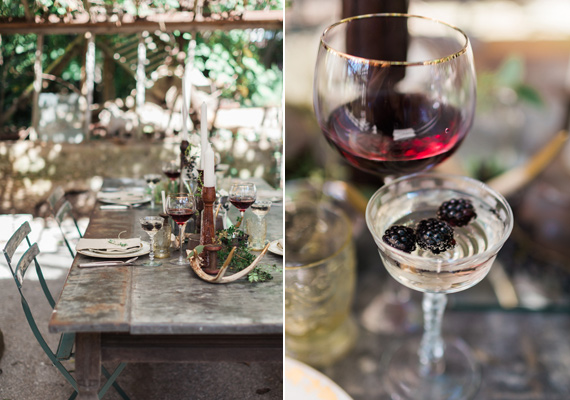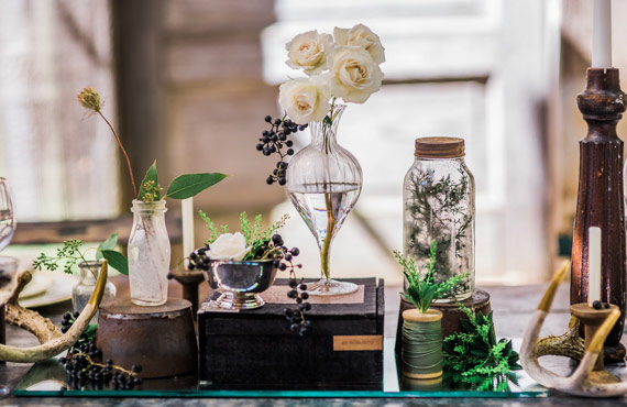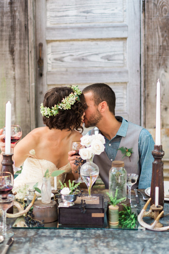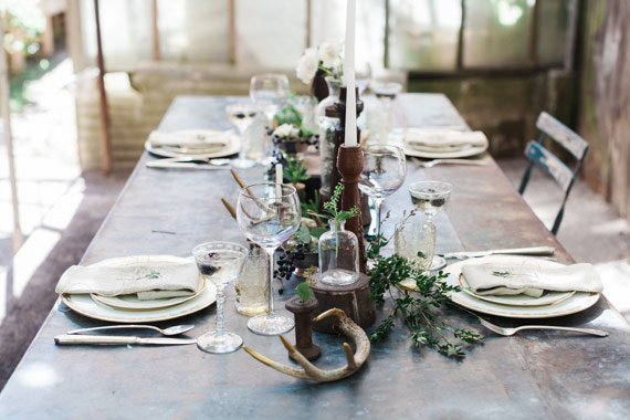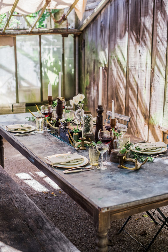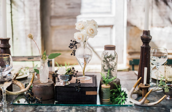 So many thoughtful details, like hand woven napkins, gold dipped antlers, spools, a cigar box, the list goes on…