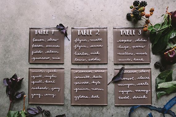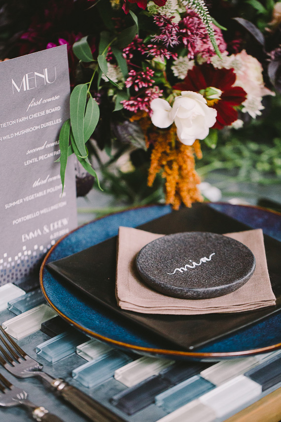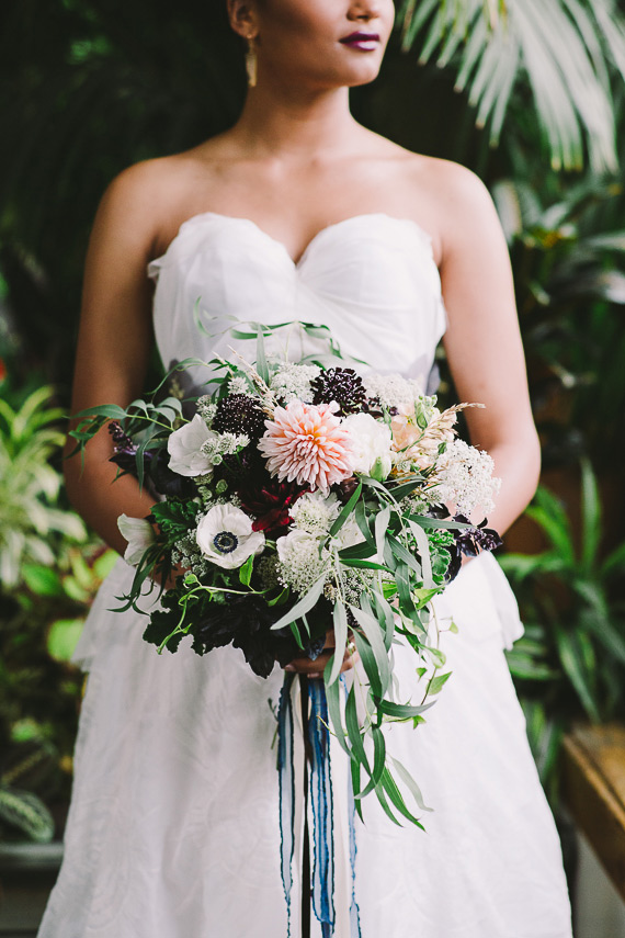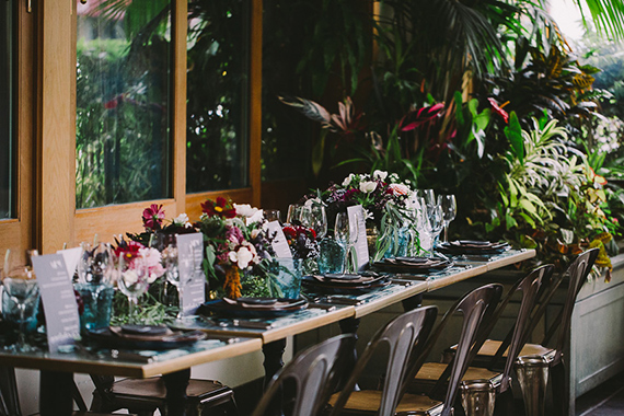 Natalie of Ginger Bee Events & Planning says, I wanted to present a dark palette in contrast to the bright garden setting of Cafe Flora. The rich and dreamy color scheme highlighted the beauty of the venue and brought out the garden feel, while adding a bit of edge.