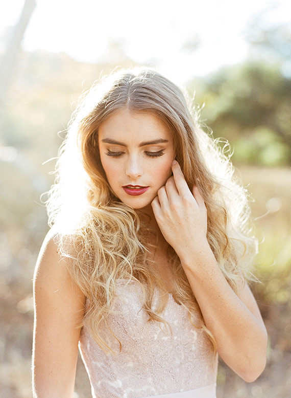 Amanda of Thorne Artistry went with a bold burgundy lip + tousled waves for the bridal look. (Btw, serious brow envy over here!)