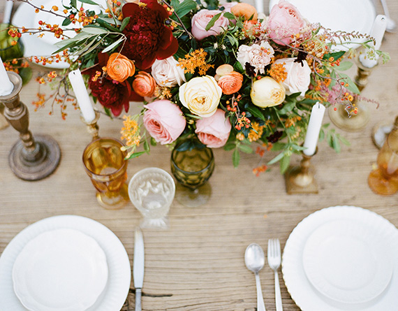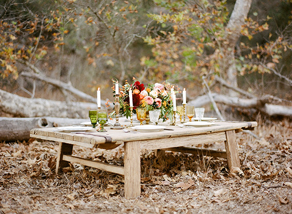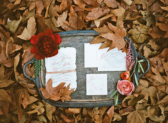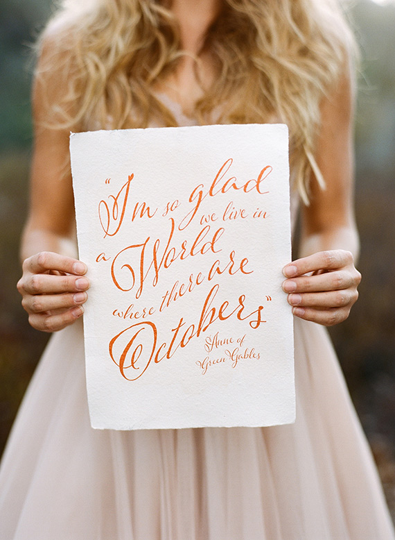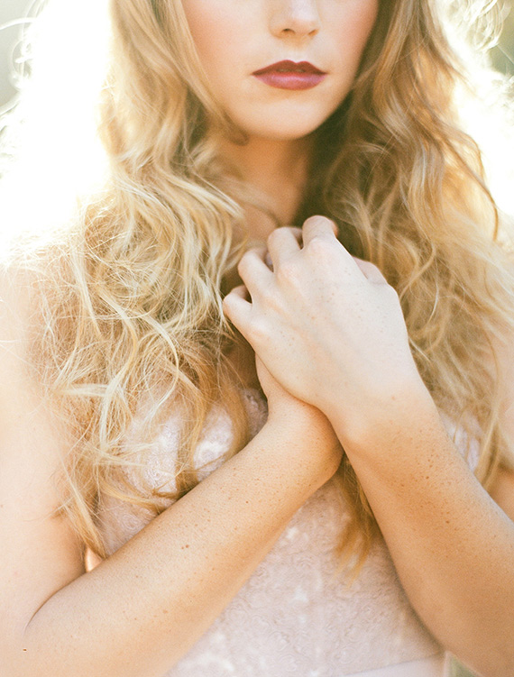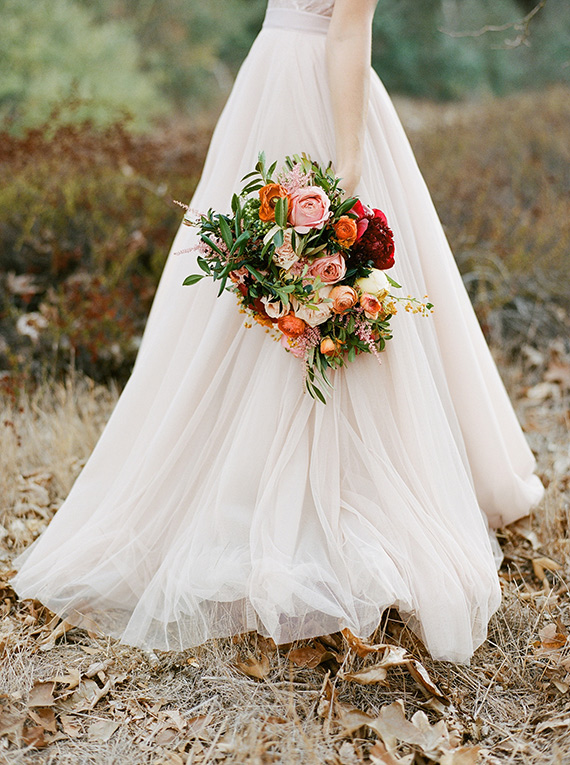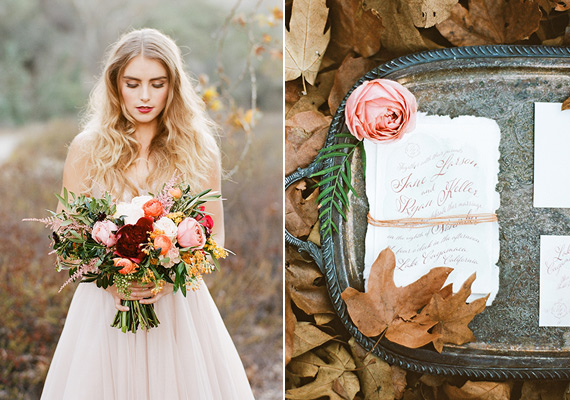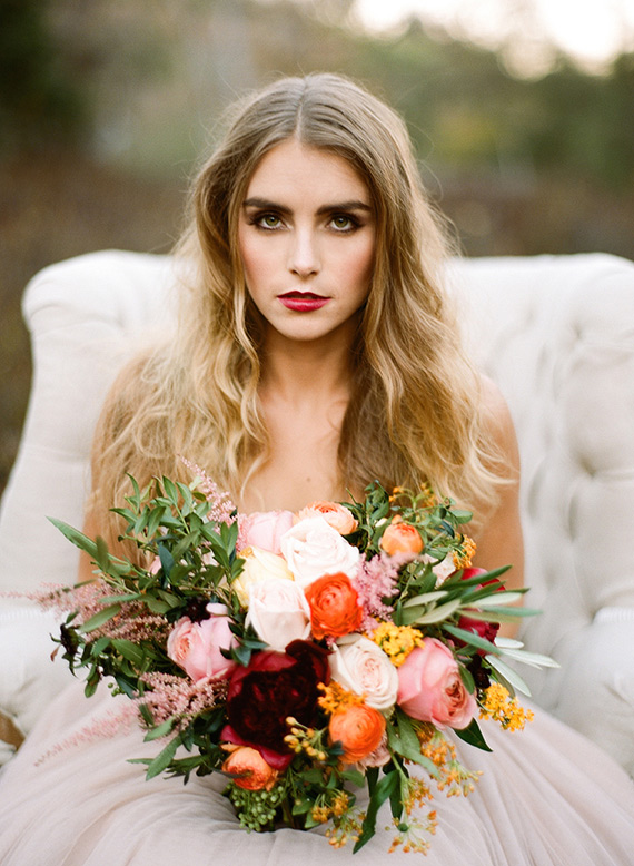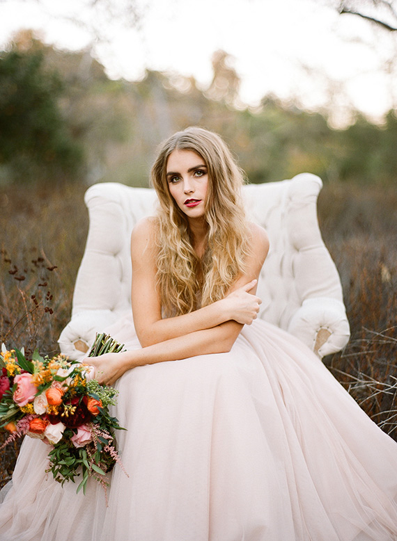 Who says you have to put away the pastels when fall rolls around? As it turns out, blush bridal fashion pairs ever so nicely with bold beauty looks and autumnal décor. What’s more is that combining the two styles doesn’t have to be overly complicated: Morgan Lamkin Photography + the team below kept the location’s natural beauty and model Jana Poole‘s fairytale ensemble front and center.