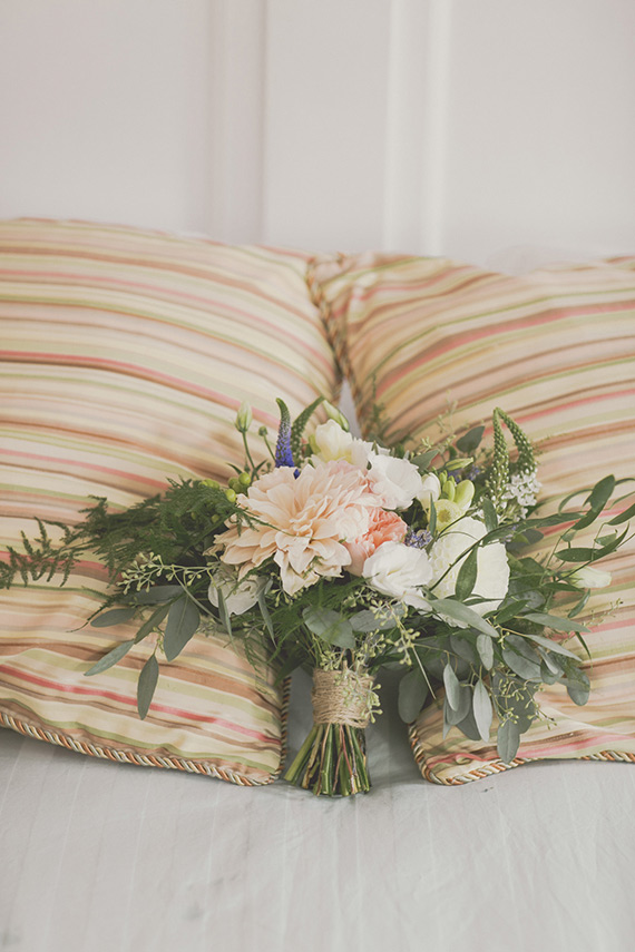 Her bouquet recipe: Juliet garden roses, coral dahlias, white lisianthus, white freesia, hypercium berries, and eucalyptus, with stems wrapped in twine.