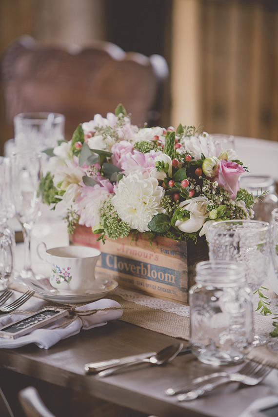 April of Olive Studio says, Each table was decorated with items that the owner of the barn had collected over years of antiquing. Glassware, china teacups, vintage silverware, various milk glass items and vintage salt and peppershakers filled the long harvest tables. Flowers were arranged in vintage boxes and in silver teapots. Each chair was different as was each teacup and saucer. Every single detail was thoughtfully considered, making guests feel like part of this vintage fairytale.