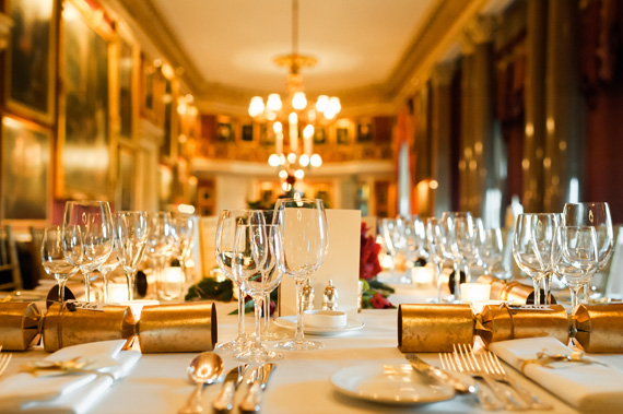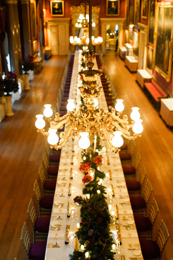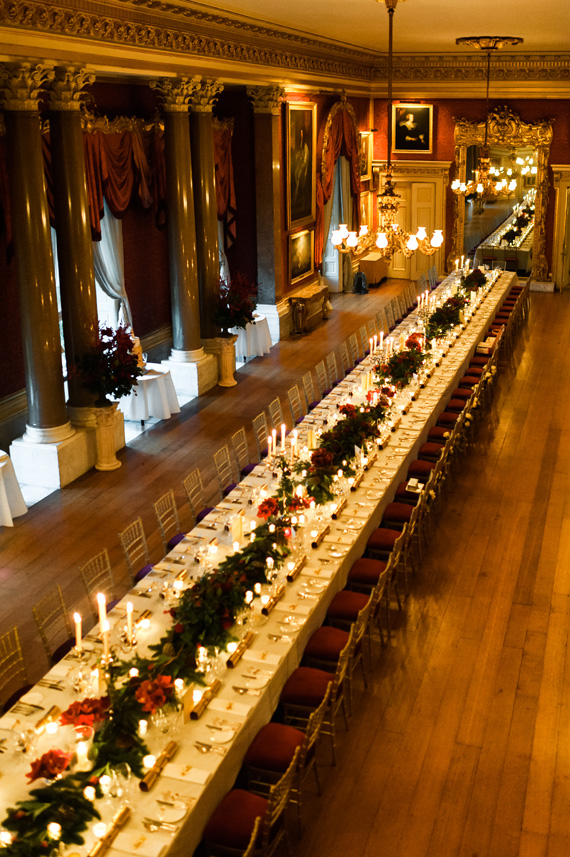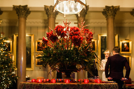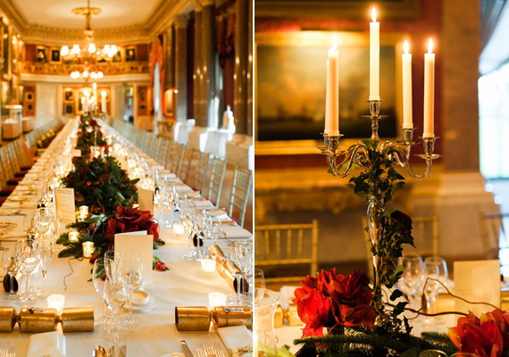 A Christmas theme meant room to get creative with lighting and décor, so they went all out with candles, gold décor, and red florals by Spriggs Petworth.