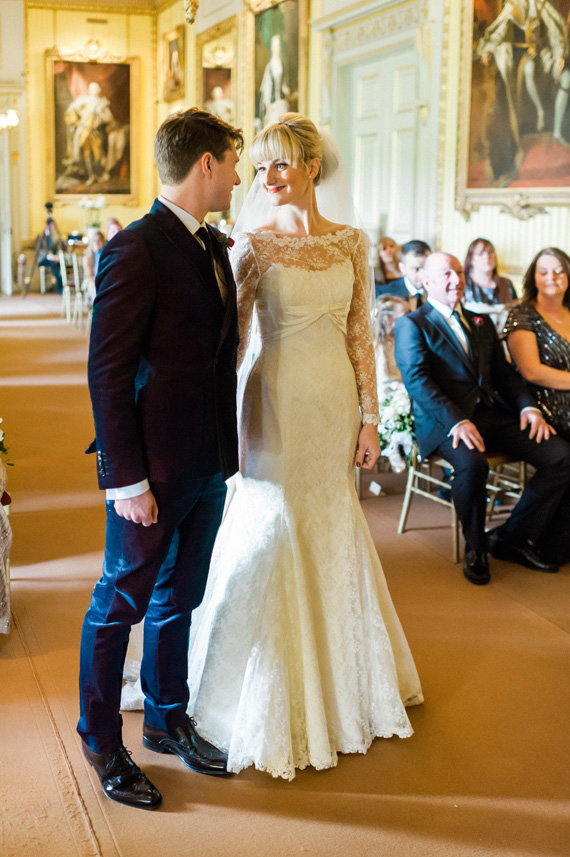 Photographer: Ann-Kathrin Koch / Venue & Catering: Goodwood House / Event Planner & Styling: Gemma Partridge Brown of Goodwood House / Florist: Spriggs Petworth / Stationery: Emily and Jo Stationery / Cake: Jess Hill Cakes / Signature Drinks: Mulled Wine / Car Restoration: Terry Bryant & Keith Miles / Bride’s Dress: Sassi Holford from The Dress in Teddington/ Shoes: Manolo Blahnik / Jewelry: Katie Rowland / Groom’s Suit, Shirt, & Tie: Ben Sherman / Shoes: Russell and Bromley / Bridesmaid Dresses: Ghost / Groomsmen: Marks and Spencer Suits