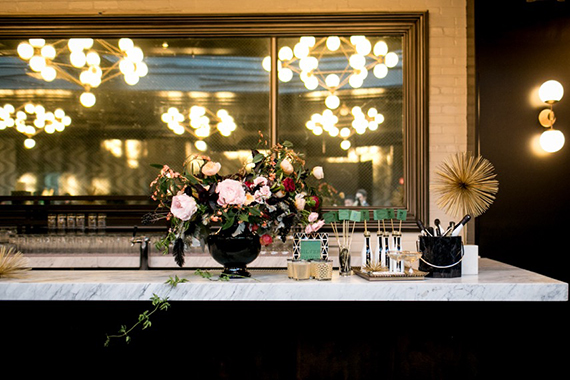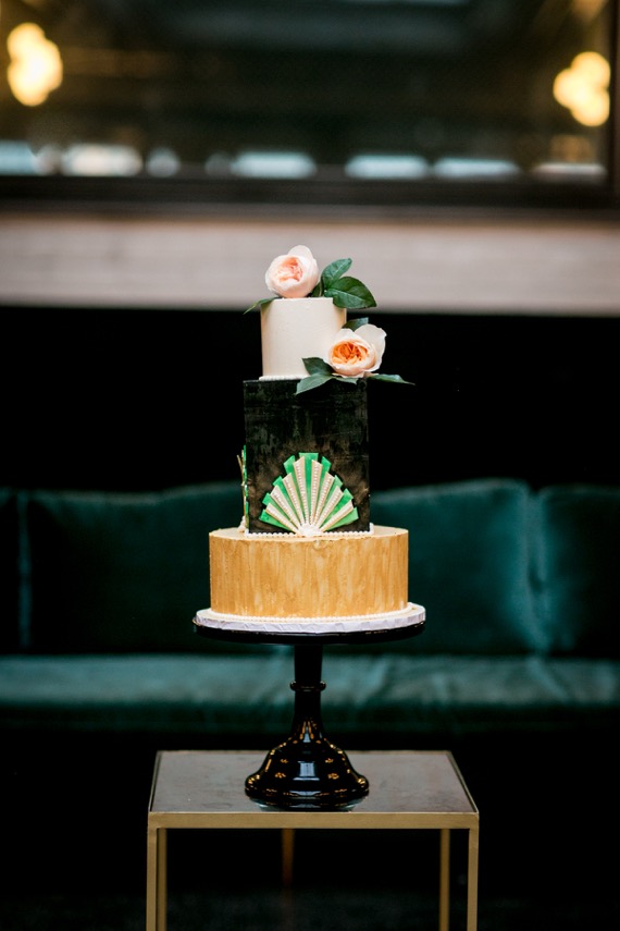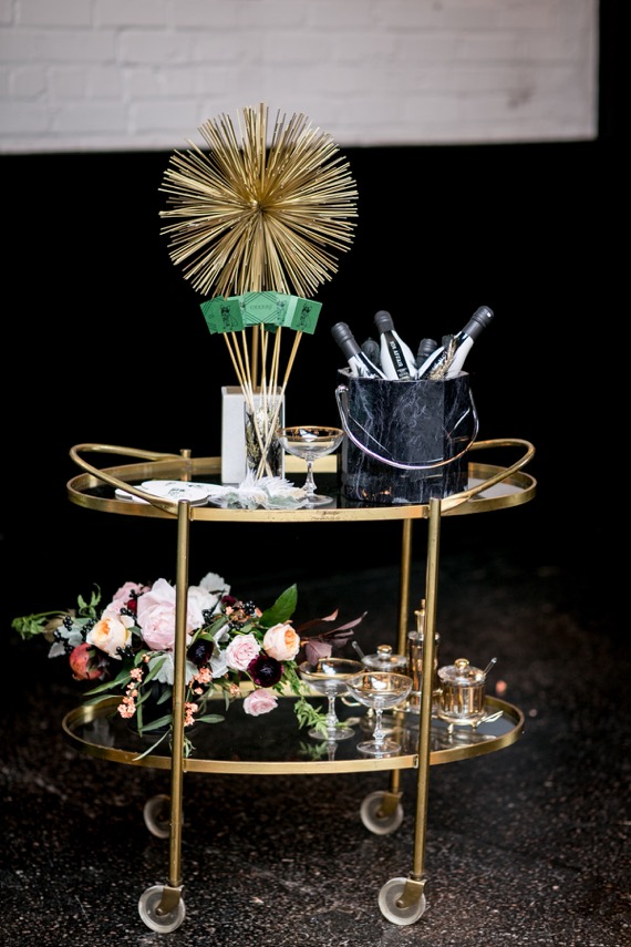 With a palette of gold, emerald green, and black guiding us, we really couldn’t go wrong! We stuck with some traditional art deco elements such as the design on the cake and infusion of gold everywhere, and the bar cart, but we wanted this to feel modern too. The florals were much lusher than typical art deco décor and the graphic glassware made things current.