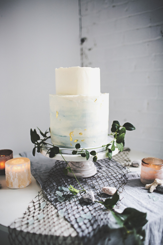 Mimicking the movement of the water, we incorporated fluid calligraphy and subtle watercolor painting on the invitations and lyrics from the yearning 1970 folk ballad, “Song to the Siren.” The delicious two-tier masterpiece of chocolate truffle cake with honey sea salt buttercream was also brushed with watery hues and flecked in gold leaf, making it seem nearly oceanic.