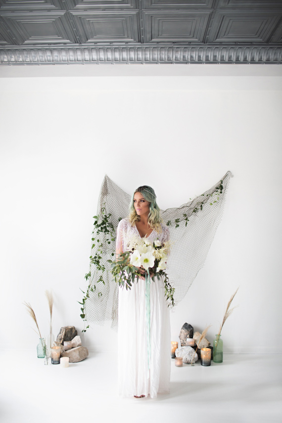 As the first snow flurries fell outside, we transported the seaside inside. This minimalist all-white studio was the perfect space to set up an organic, sea inspired setting. Our bride, a beautiful blue-haired siren, wandered barefoot through the scene, clutching white winter flowers wrapped in layers of hand dyed silk, as she waited for her seafaring love.