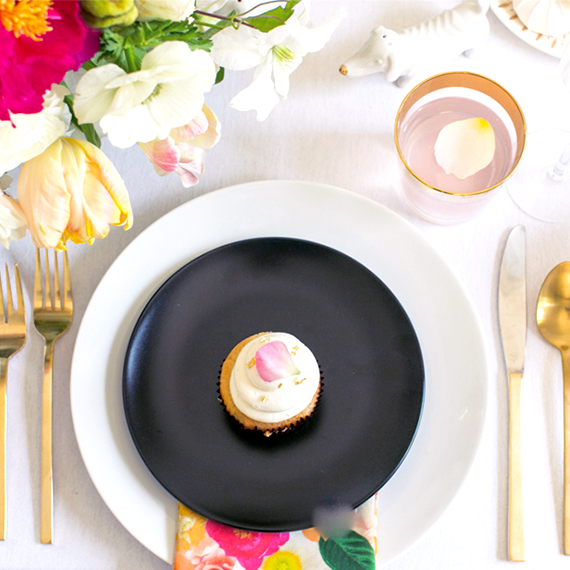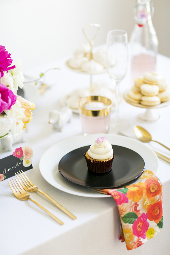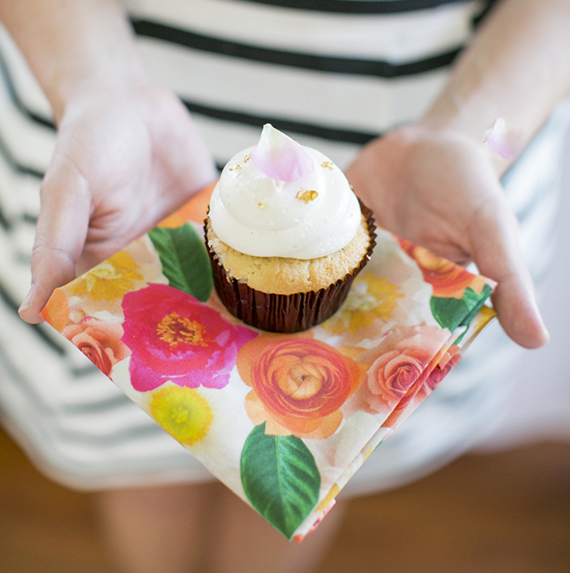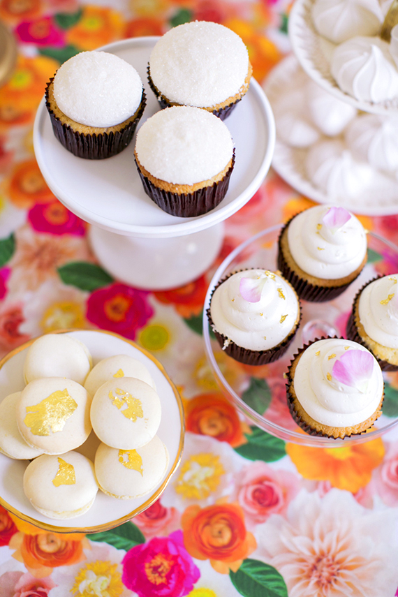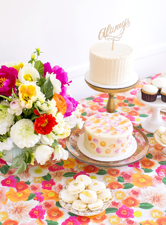 Using the same fabric, we made a quick tablecloth for the dessert table, and carried the floral theme even farther when we dressed one of our cakes in petals. (Side note: if you plan to do this for your own party, be sure to research which petals are approved for eating!)
