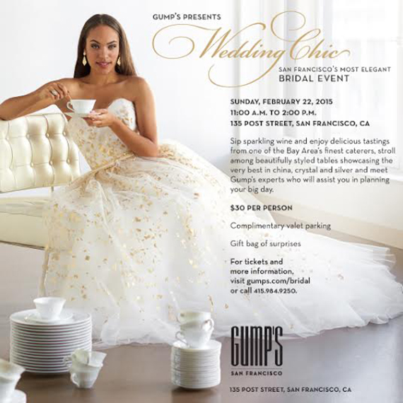 Hey cakies! Have you RSVPed to the Gump’s bridal event coming up this weekend in San Francisco? There’s still time! Here’s all the info you need…