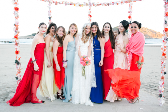 Wedding day: Guests relaxed on the beach (surf, kayak, beach volleyball), bride got ready in the early afternoon with bridesmaids, mother, and aunts, while the groom prepped on the terrace with his guys. Damla walked down the aisle to Somewhere Over The Rainbow at sunset.