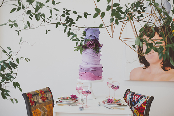 If you want to get creative with your shoot, what better way than to start with an inspiring space? Salt Lake City’s CUAC provided just the contemporary background—with expansive white walls contrasted with colorful abstract portraits—photog Chantel Marie needed to kick off a series of edgy, avant-garde bridal scenes. Oh, and there may or may not be a crazy cool ombre purple cake involved…