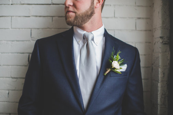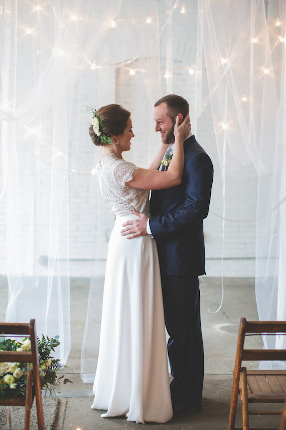 The perfect stage for a vow exchange was achieved by another ingenious DIY idea: hanging tulle and ribbon, illuminated with strings of bistro lights, along the warehouse’s steel beam using simple magnets creating a soft and romantic backdrop. The concrete candleholders were arranged along the chair rows to bring the same romance to the aisle.