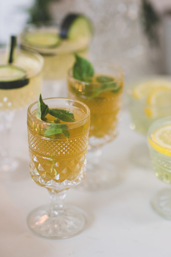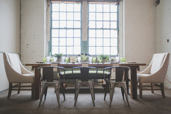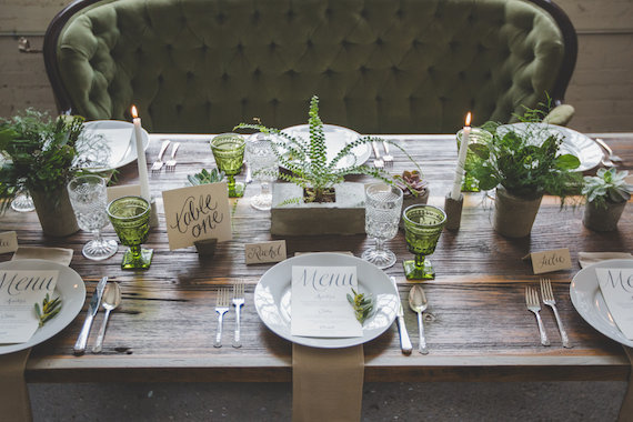 The concrete planters and candleholders also served as the centerpieces of the picturesque table scape. The rustic farm table was decked out in antique silverware, clean white plates, and neutral linens. Beautiful menus and a sprig of yellow mimosas flowers added a pop of color and dimension to the design. Guests sat around the table on cool metal café chairs and cozied up on the beautiful green antique sofa; the contrast made for such stylish and eclectic seating. The heads of the table were meant to seat the Bride and Groom, whose attention would be drawn to by the chic ivory upholstered chairs with a bronze studded detail trim.