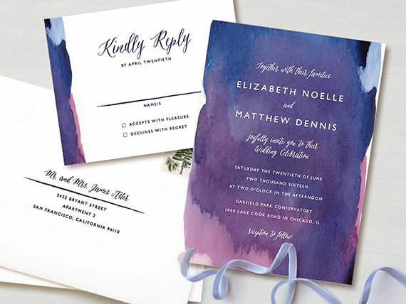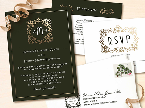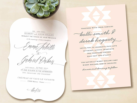 With Minted you can also make sure all your details match by getting custom day-of goodies too, like menus, programs, and the like. (And if you don’t see what you’re looking for, just ask their design team to create it—they’re available daily from 8a-6p PST.) Custom services include: custom color real-time viewing, a dedicated “Perfection Team”, free guest name printing on matching envelopes + more.
