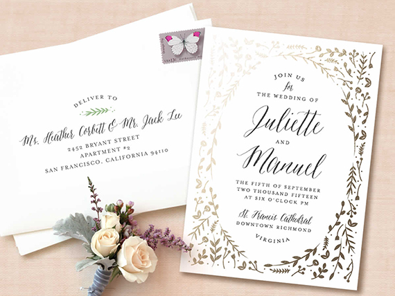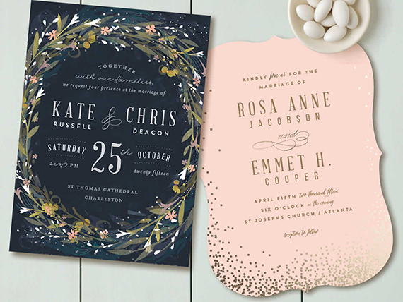 Yay x 100, guys. Minted’s 2015 line of wedding invites is here! We’ve got one heckuva giveaway to celebrate, whoo hoo! But first, let us gush over the new designs, which basically encompass everything we love about wedding design this year: flirty florals, hand-painted details, gold (or rose gold or silver) foil, and lots more—here’s a peek: