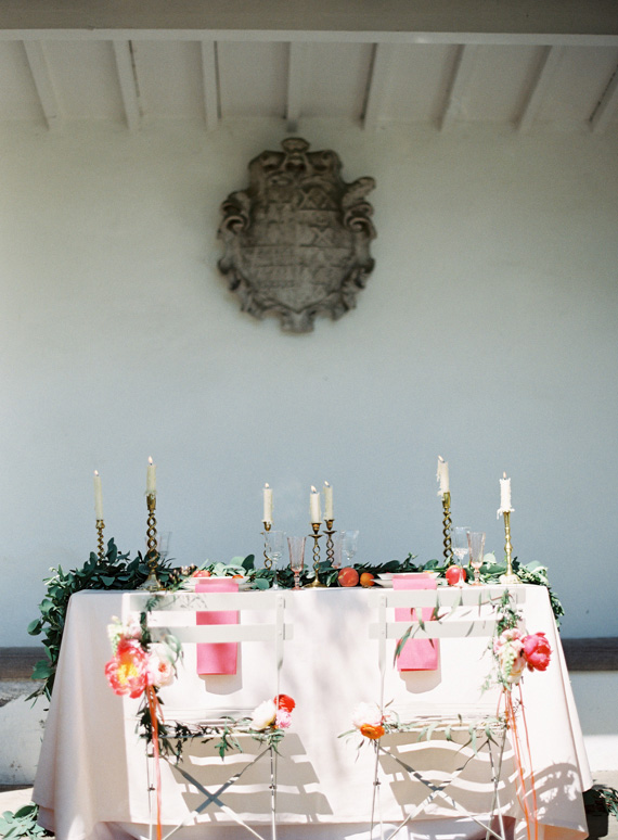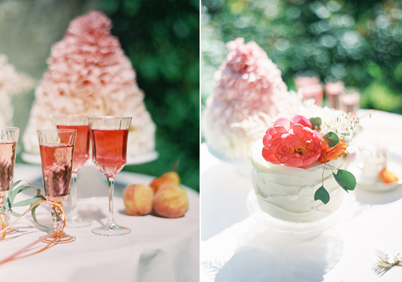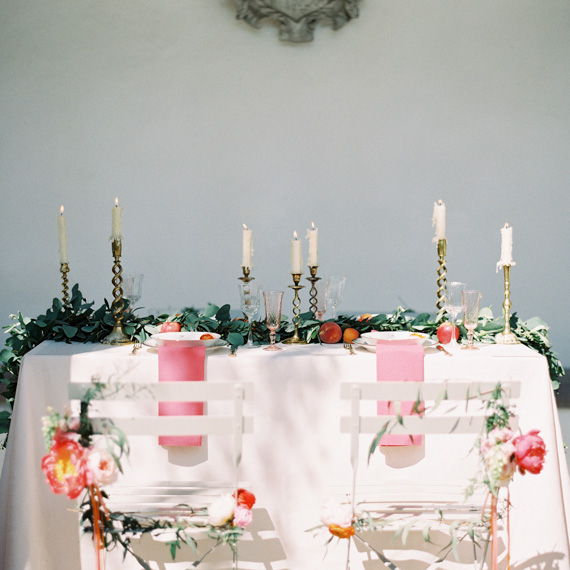 Sarah’s delectable description of the desserts: Cakes of white and pink ruffled chocolate bouffants adorned with flowers and tables with peaches, blush pears, and garlands of fragrant eucalyptus.