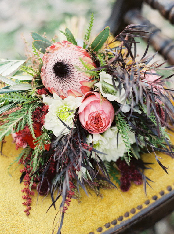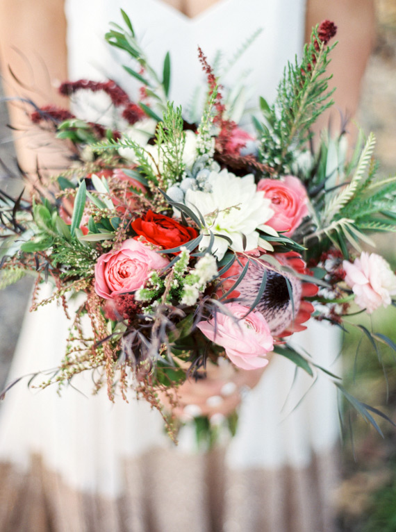 If sequins can work in the décor, they’re sure to work with the dress. The ladies that pulled together today’s midcentury modern wedding inspiration merged soft bohemian touches with more masculine vibes, establishing a balance between the stark lines of midcentury modern + those romantic boho accents. From planner and designer Ashley of Two Be Wed‘s choice in furniture and décor to this gold-dipped gown, the contrast isn’t lost on us. Balance is key, friends!