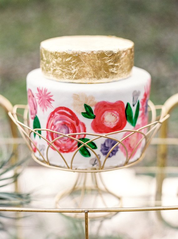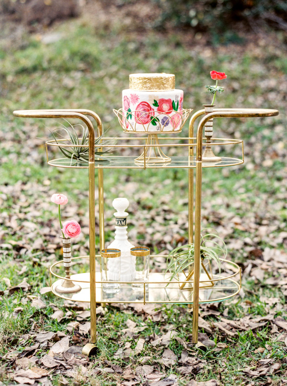 Dana says, The perfect example of this (and one of my favorites!) is the gown by Truvelle, as it starts as a simple sweetheart neckline and then ends with an amazing gold-dipped sequin train. Everything about this shoot was more than we could have hoped from the beautiful hand painted cake by Buttercup and to the beautiful and flawless florals by the talent Flower Power Productions!
