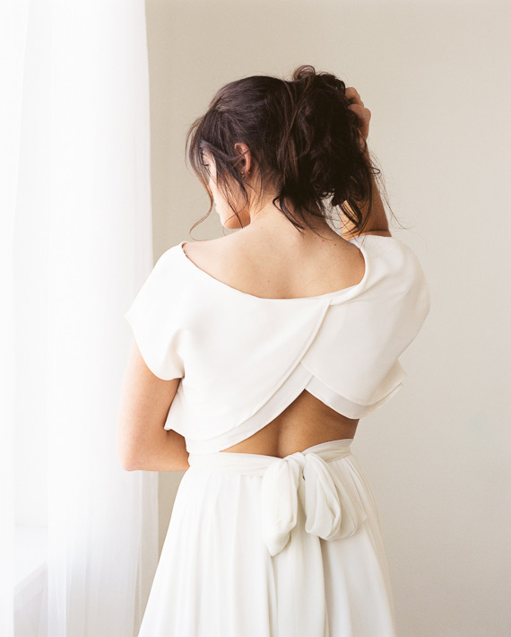Big time swoon over the scalloped wrap-back and skirt tie in this bridal ensemble by Jann Marie. One could even get away with these stunning separates post-wedding, yes?