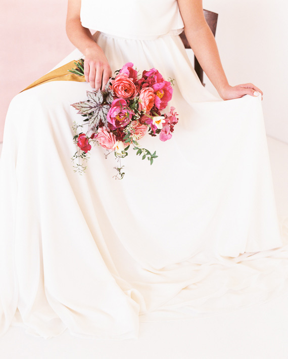 Travis of Travis J Photography explains, This spring shoot was inspired by the color pink in all its various tones. The pale pink backdrop and the vibrant pink florals helped set the spring mood which felt simplistic and refreshing. I chose to shoot in a natural light studio using mostly film to give that soft intimate feeling. Jann’s simple two-piece gown was fluid and modern in design which tied everything together so beautifully.
