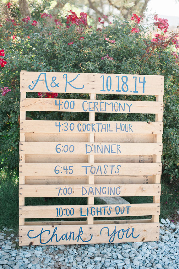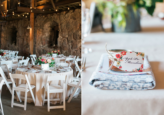 Lauren of Lavender Grey Events says, The bride, family, and friends made everything for the wedding from the vintage marquee sing, the giant A+K letters for the barn doors, hand-stamped table number cards, table numbers, painted frames, and the signage. Amanda hunted rustic items from flea markets that I went to town with on the day of the event. The best baseball touch was a beautiful bench for two made by Amanda’s father out of all of Kevin’s old baseball bats from his journey from the minors to the majors.