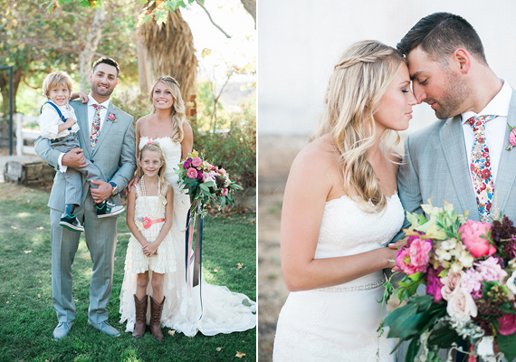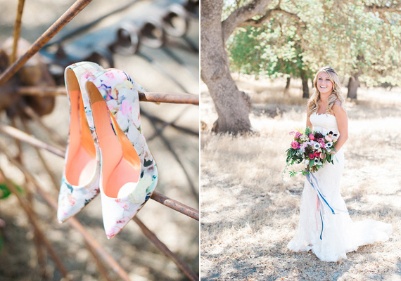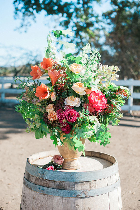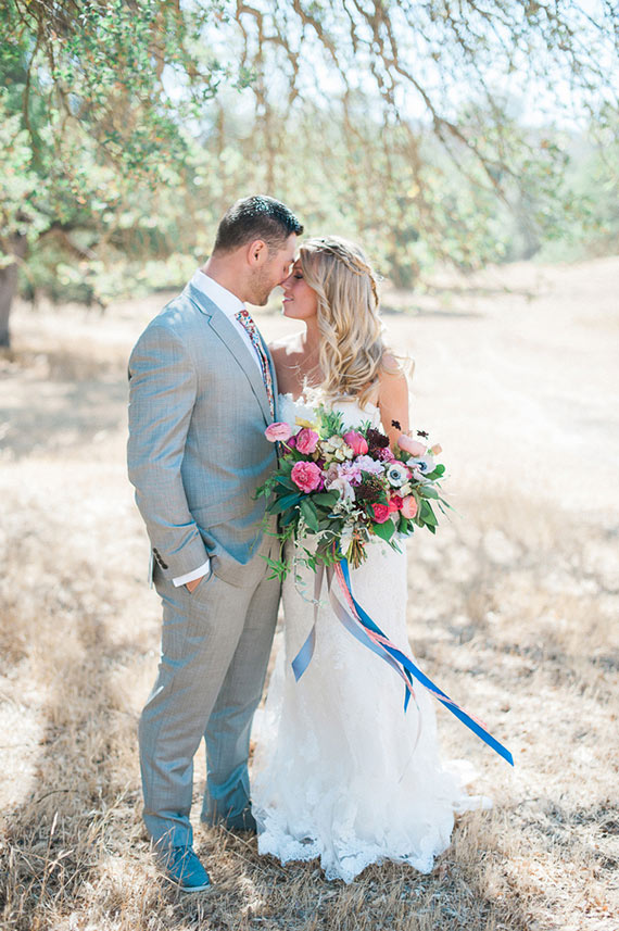 Kevin + Amanda’s wedding has everything you’d want in a rustic outdoor affair. Barn? Check. Oak trees? Uh huh. Sprawling ranch landscape? Huge enough for lots of colorful décor and DIYs. Exactly why after seeing several venues, they were sold on Santa Margarita Ranch. Mix in a bouquet overflowing with garden roses, anemones, ranunculus, cascading greenery and ribbon, and we’re in business! Brandi Welles captured it all below: