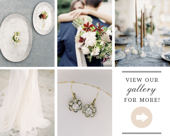 These blue and metallic wedding ideas come from Jen Huang’s last artist workshop, which involved attendees designing gorgeous centerpieces, photographing their own creations, and then getting behind the camera again for an outdoor couples session, to name a few activities. A wedding design + florals by the talented Poppies & Posies inspired everyone’s work, and we think it’s time it got to inspire real weddings too… Just look at all the pretty details.