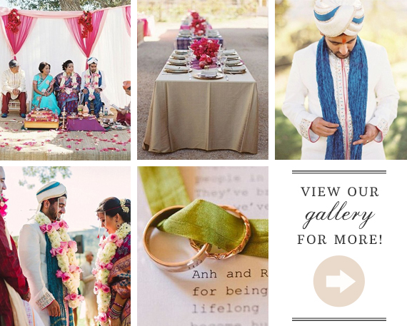 Anh says, We wanted something organic with natural arrangements, colors and textures as our foundation. Then everything else would have a bohemian type of elegance. The whole style of the wedding really emphasized our laidback attitudes. For their Indian wedding they turned up the color and had DIY sari fabric and spray painted gold elephants for the décor accents. Such a good contrast!