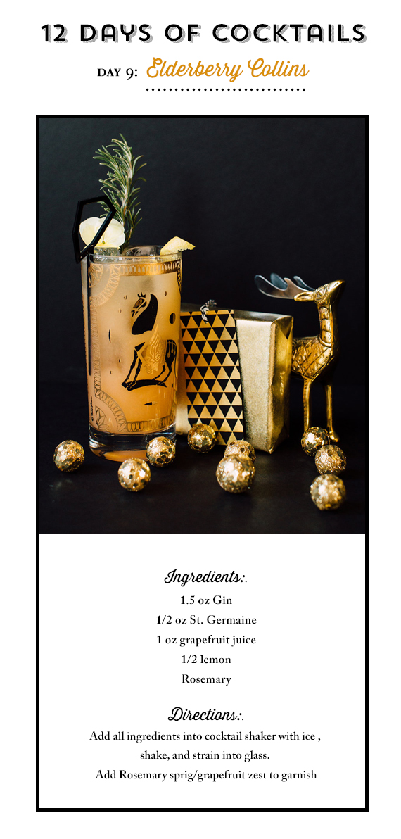 It’s Friday the week before Christmas and 12 Days of Cocktails continues. Going to be a good day, right? Up next is the Elderberry Collins, complete with fabulous drink accessories from The Roc Shop and photos from Plum + Oak Photography for you to model your work after. Big thanks to Please & Thank You for providing all the spectacular drink recipes this month.