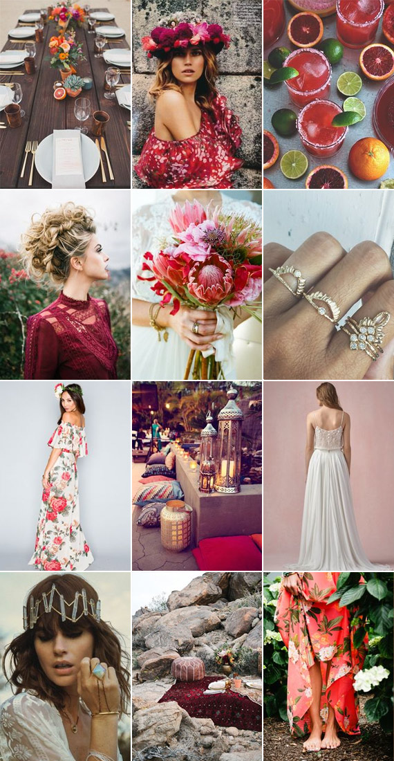 Bohemian, beach, eclectic, exotic, intimate, comfortable, a celebration of love. Rich reds, pinks, and burgundies inspired by Mexican and Moroccan textiles and dusty sage and soft neutrals to blend with the natural beach elements. I was really inspired by the mix and match colors and patterns of the Show Me Your Mumu bridesmaid dresses and the floaty, flowing, ethereal qualities of the Watters wedding dresses that felt at home barefoot on the beach but glamorous enough for such a special day.