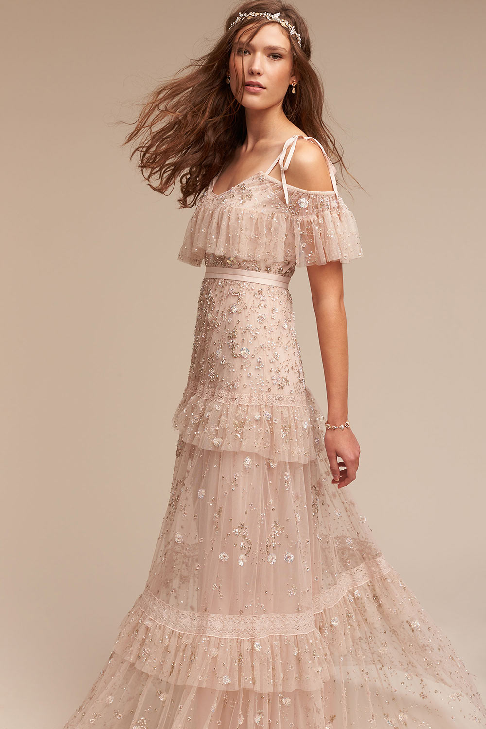 The silhouette and tiered ruffles in the Wyndham Gown give this romantic embellished gown a bohemian side.