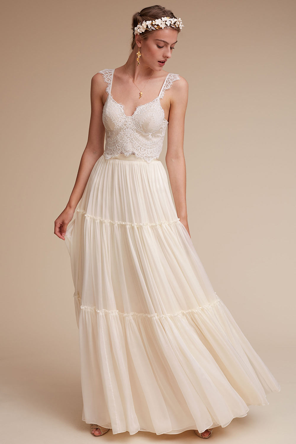 They also have bridal separates like the Iris Top & Agatha Skirt, so you can truly create a unique look that’s entirely your own. The soft lace top elevates the look while the airy skirt keeps it down-to-earth.