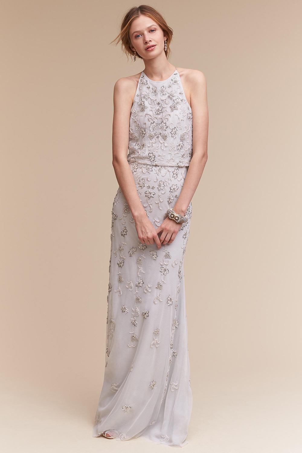 The Starling Gown comes in this dreamy shade called Dove, and is adorned with beads, sequins, and crystals throughout.