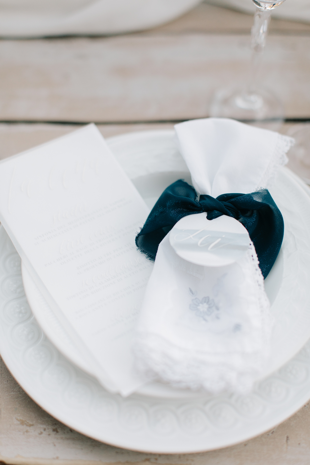Martina says, From the day I started planning this shoot I knew I wanted macramè for the ceremony backdrop, and the girls from Mahramatun made it possible, creating this stunning arch that our great floral designer Sara Cattaneo adorned with lots of beautiful blooms. I imagined a table setting with warm and rich colorful accents, as the beach with its neutral colors was the perfect background already. The unusual color combination of the flower arrangements paired perfectly with the vintage tableware and natural linens from Heyfoo. The cake was created by the very talented Lucia Mosci and then handpainted by me with loose floral elements in the blue of our palette.
