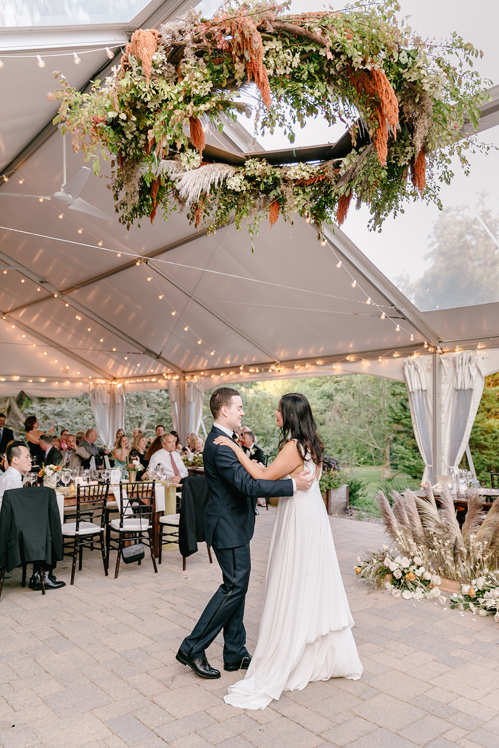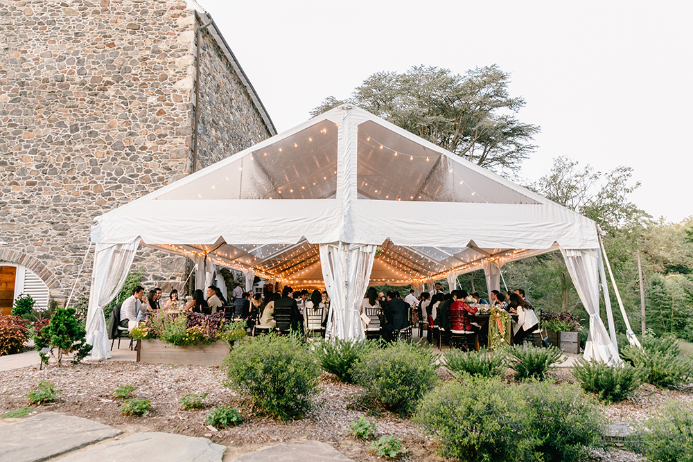 Emily of Emily Wren Photography explains, Yuhe & Adam’s wedding at the historic Tyler Arboretum was a vision of early fall imbued with natural grace. Everything about their celebration reflected the earthy elegance of the venue. Design elements in soft earth tones were expertly balanced with cascading florals in autumn pastels from Oleander Florists. Luxurious floral runners poured across rustic farm tables and spilled over the ends in a waterfall of texture. The bride’s bouquet was built around a swoon-worthy pale chartreuse protea, and featured blooms in muted shades of apricot and coral.