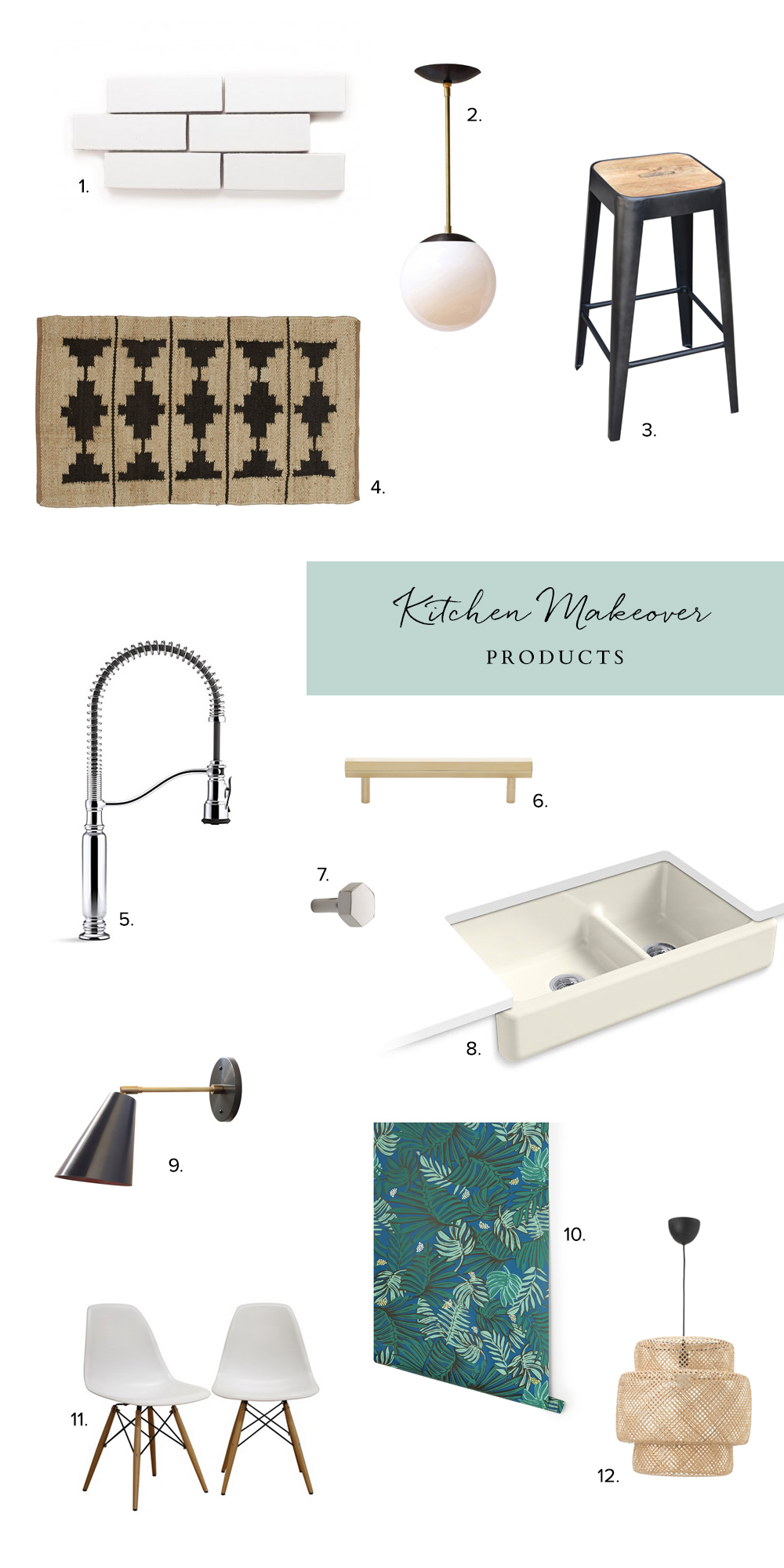 1. Fireclay tile / 2. Cedar & Moss / 3. Black Stool / 4. Rug / 5. Kohler Faucet / 6. Brass Drawer Pulls / 7. Brass Drawer Knobs / 8. Kohler Farmhouse sink / 9. Cedar and Moss / 10. Hygge & West wallpaper / 11. White chairs / 12. Ikea Lamp / 13. Custom Floating Shelves