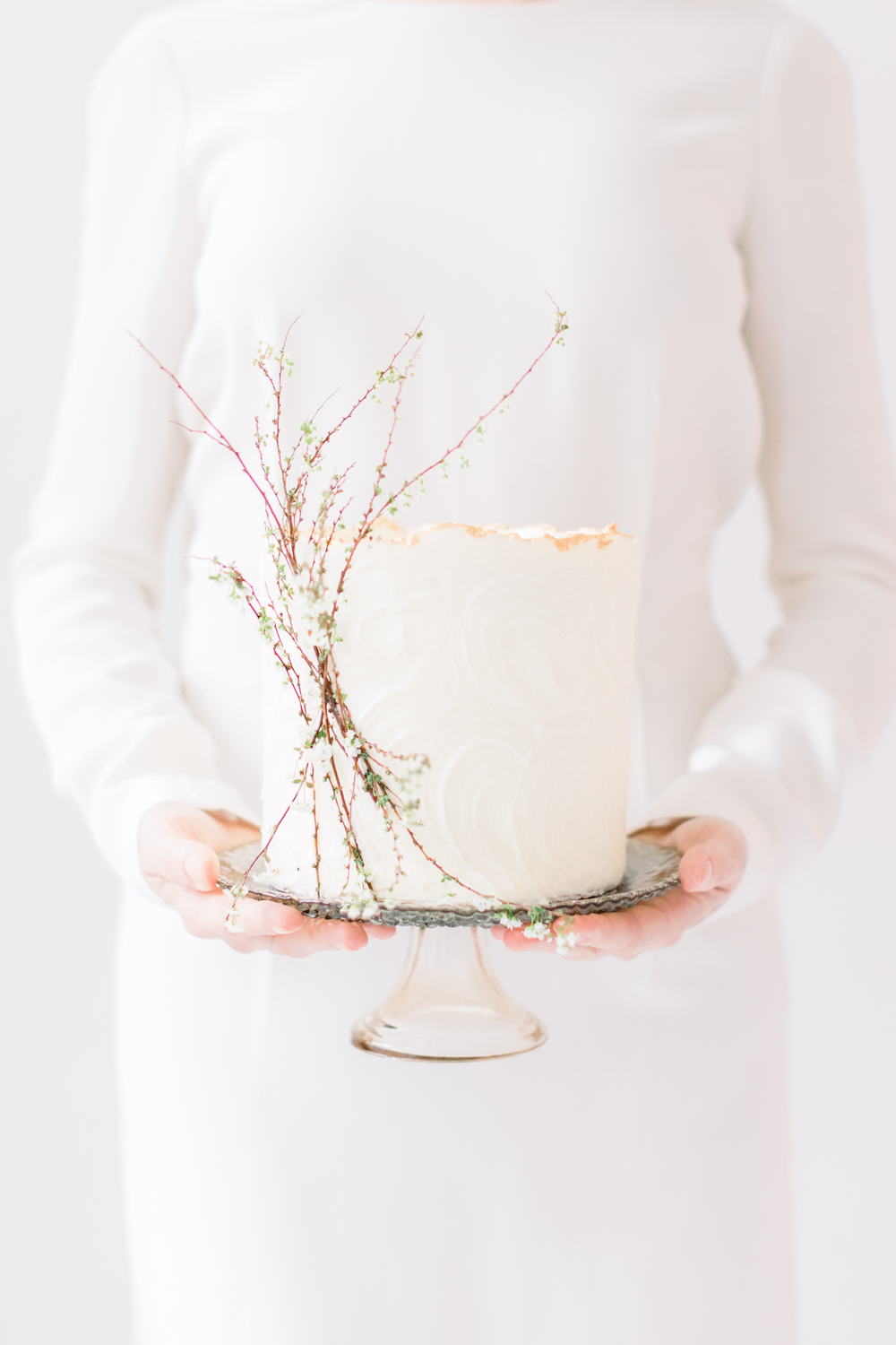Ayenia of Ayenia Nour Photography explains, I wanted to work with colors that will inspire romance and femininity, but grounded by many earthy elements such as branches, a foraged bouquet and the foggy old window. To incorporate some modern elements I opted for gold metal accents for the tableware and candle holders. My goal was to invite to viewer to get lost in the beauty of the details, for that reason I choose an all white natural light studio to avoid all visual distractions. All vendors were invited to express their creativity and add their personal touch, we were thrilled to add such a unique, edgy but timeless element such as the fascinator hat combined with a bold lip color.
