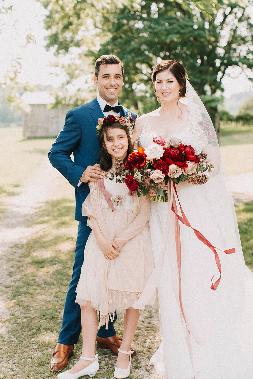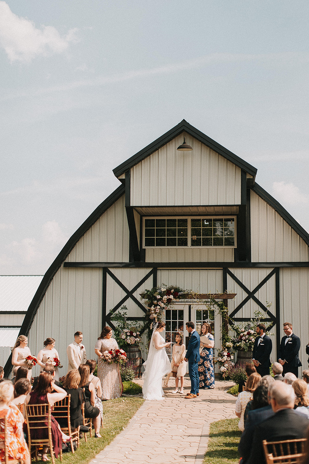 If you love a good jewel-tone color palette or a beautiful barn venue, you’re in for a real treat with Georgia + Anthony’s Indiana wedding as planned by Morgan of Ashley Weddings & Design. It’s such a perfect example of how to set the tone for your wedding and continue it throughout each and every part of the day. Not to mention, it’s got the sweetest story of how they incorporated this cutie flower girl, the groom’s daughter Marlo, into their ceremony. Photos by Courtney Sinclair below!