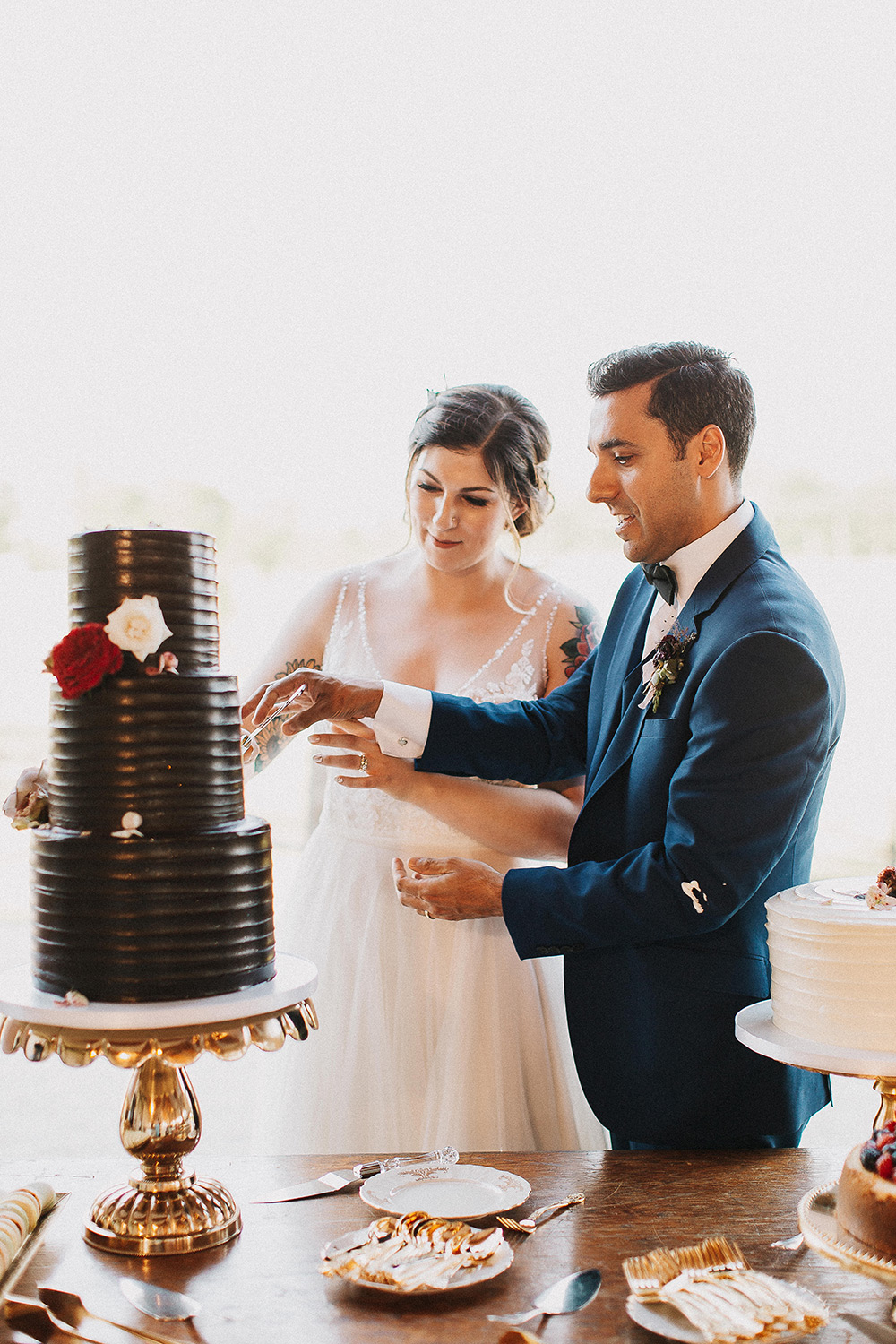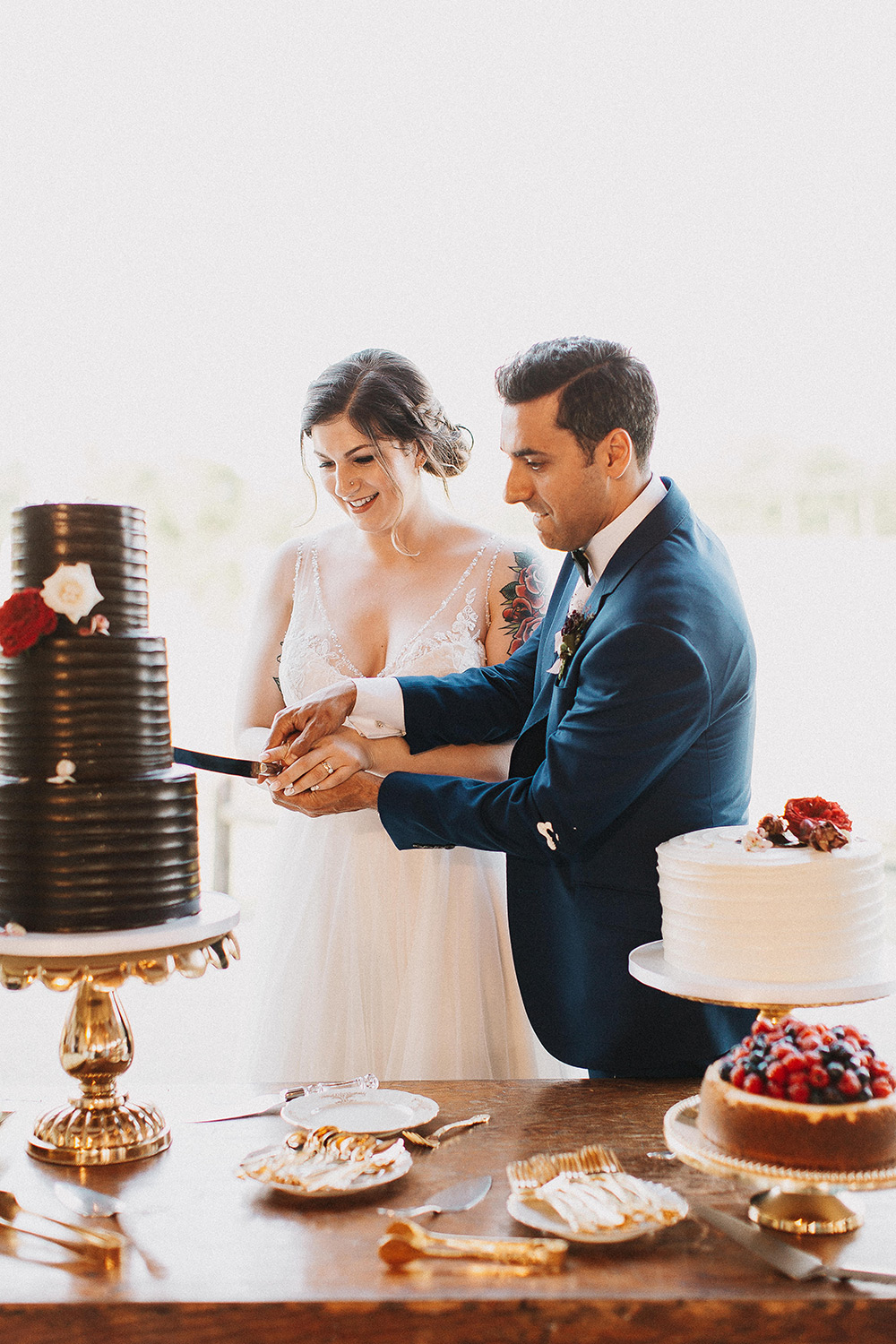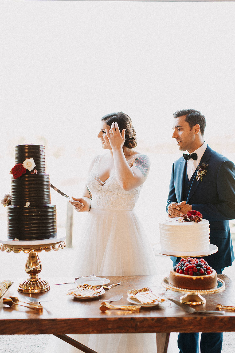 We actually had more traditional fall colors, with rich jewel tones. We didn’t really have a theme, but we did take a lot of our decoration cues from Alice Waters, decorating with whole fruits and herbs along with floral arrangements. My husband is a chef and he loves Alice Waters, so it was actually his idea to incorporate these elements and it was gorgeous! My style was reflected in some of the more elegant pieces, including our head table seat which was rented from Violet Vintage , and our hand painted invites. Also, our dessert table was all me. We had an insane assortment from The Cake Bake Shop, which really reflected my love of sweets and cake!