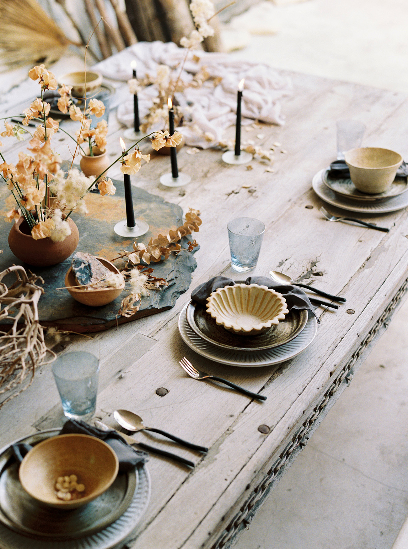 Count us in on this table setting by Hilde Stories, full of muted October colors.