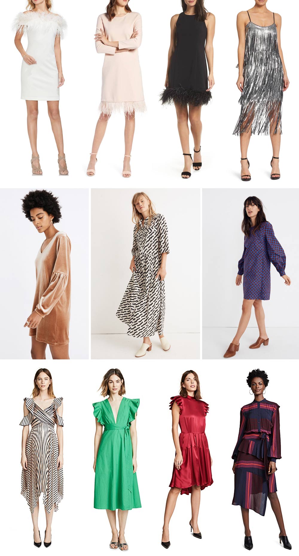 white feather dress | blush feather dress | black feather dress | silver dress | peach velvet dress | black pattern dress | blue and red dress | black and white striped dress | green dress | red dress | striped dress