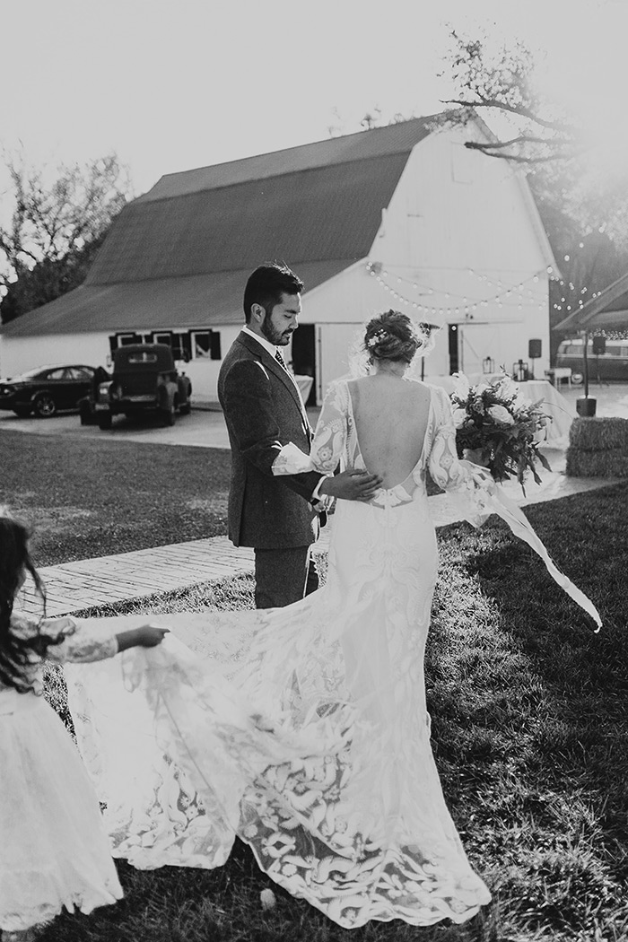 Photography: Emma of The Bold Americana / Venue, Coordination, & Catering: Fresh Air Farm in Kansas City, Missouri / Floral Design: Amyann of Daylight Mind Design / Hair & Makeup: Ashley at Lumine Salon / Invitations: Minted / Cake: McLain’s Bakery / Rentals: Fresh Air Farm & Ultrapom / Bride’s Dress: Rue De Seine from Bride KC / Shoes: Wandering Coyote / Headpiece: Twigs & Honey / Earrings: Lily Dawson, Rings: Angeline Designs / Lipstick: Dior / Eye Palette: Too Faced / Bridesmaid Dresses: BHLDN & David’s Bridal / Groom’s Suit & Tie: Suit Supply / Shoes: DSW / Wedding Band: The Polished Egg / Groomsmen: Suit Supply & Macy’s