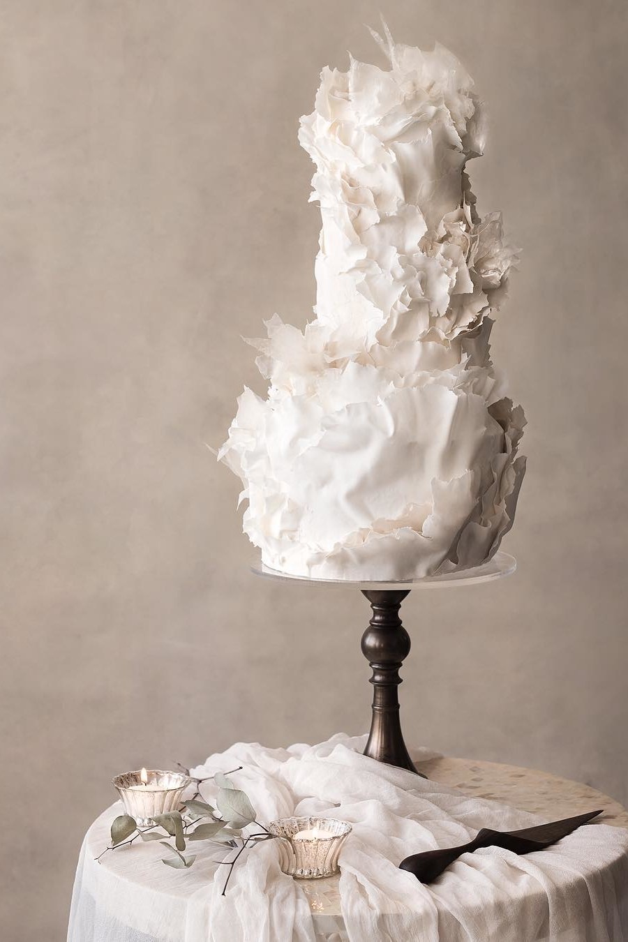 The 100LC wedding cake gallery just got a whole lot dreamier, Cakies, thanks to this drop dead gorgeous cake by Jasmine Rae Cakes and many more fine art cakes below. From delicate layers of ruffles that look like carefully torn paper to hand-painted leaves and flowering branches, these sculptural wedding cakes are seriously breathtaking! (Photo by Blair Heagerty)