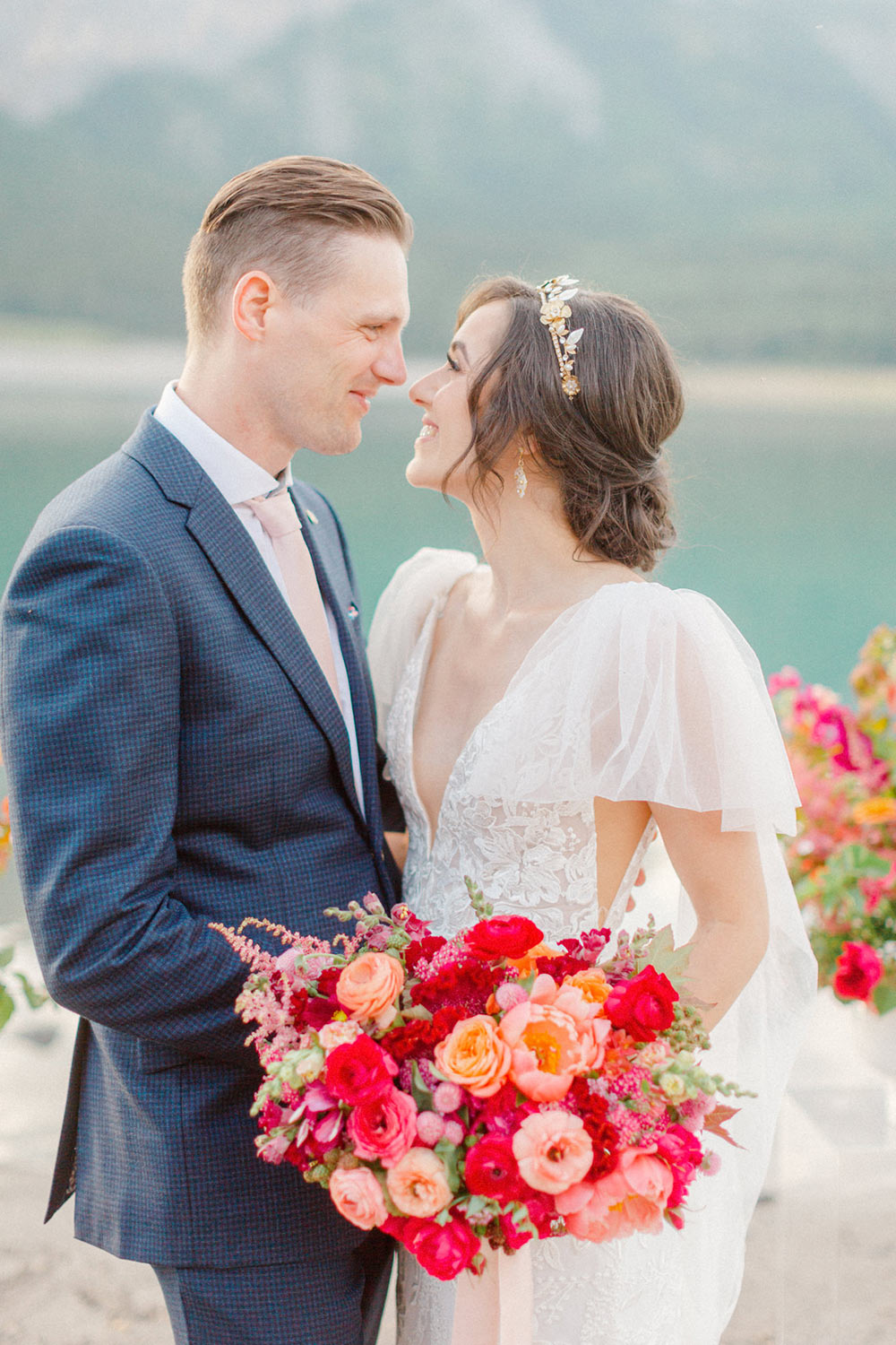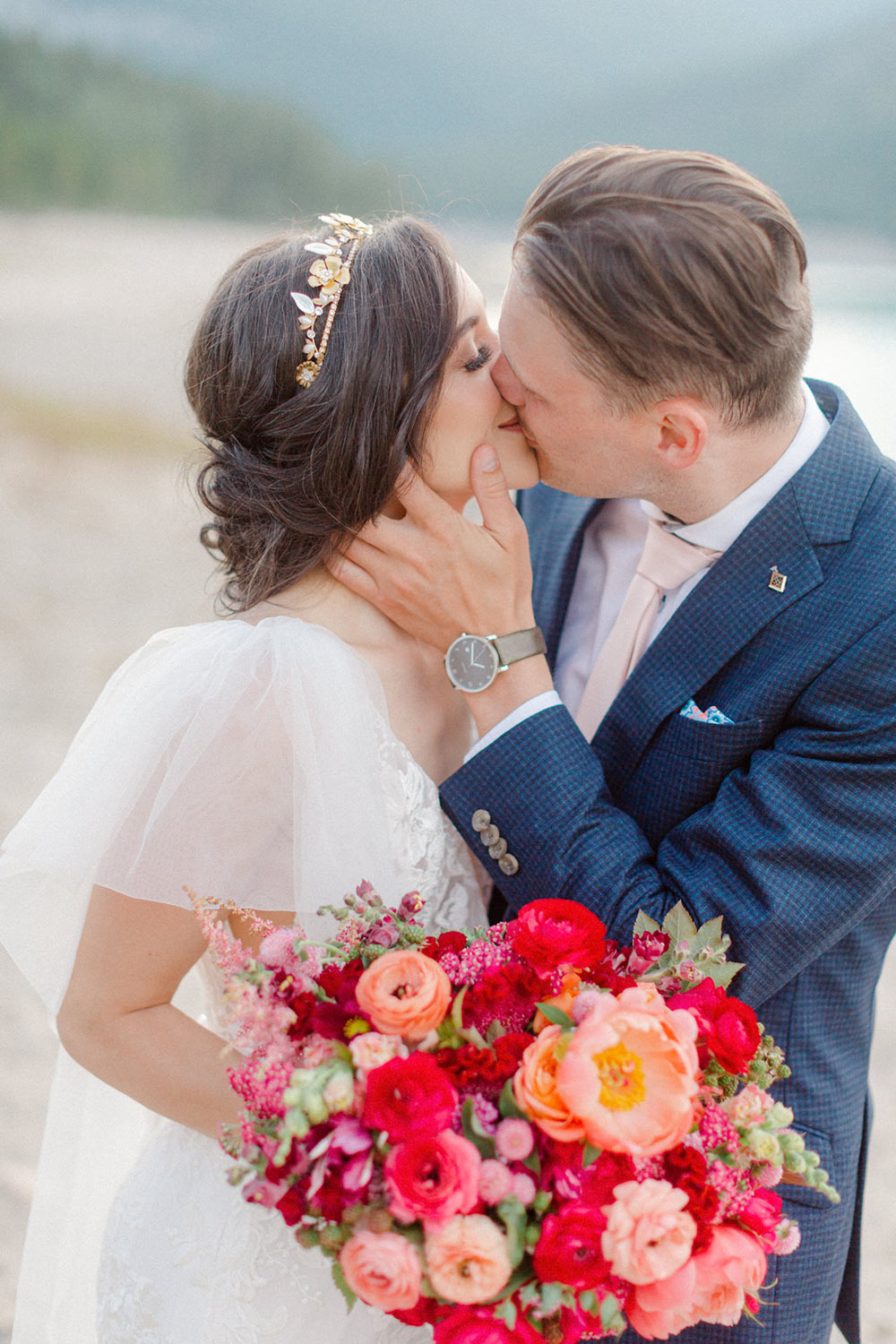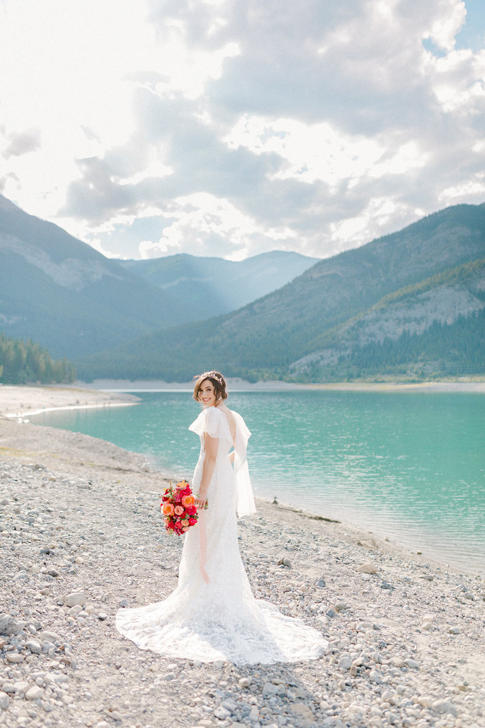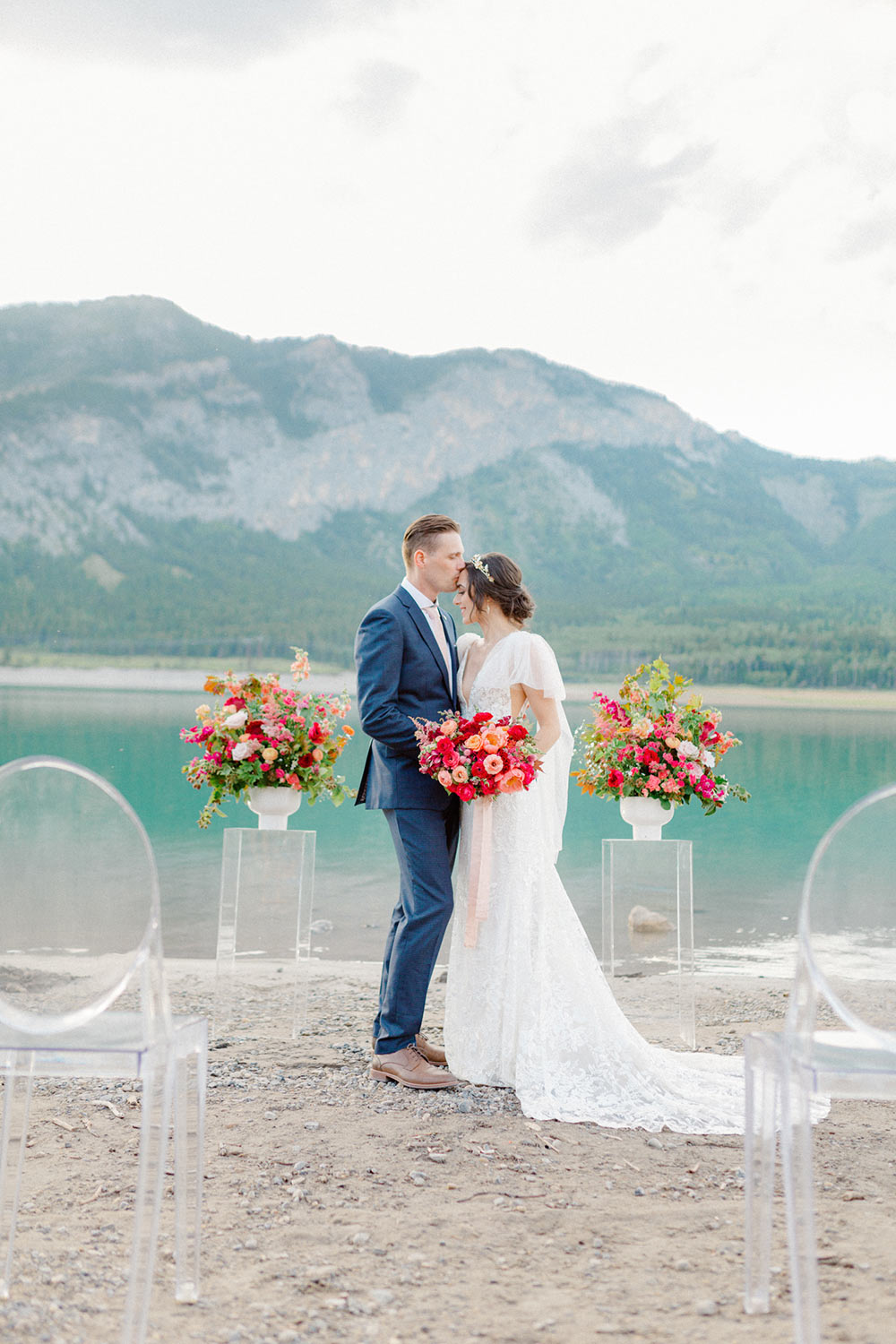 With so many weddings being significantly downsized this year this team wanted to showcase a slice of the Canadian Rocky Mountains that is often missed out on! Kananaskis is slightly southeast of Banff National Park with one of the most unique lakes in the area with sand surrounding the water edge. To celebrate love during such a tough season they opted for an incredibly bright color palette full of the happiest colors like coral, raspberry and peach. They wanted to create a feeling of a destination elopement in their own backyard of the Rocky Mountains.