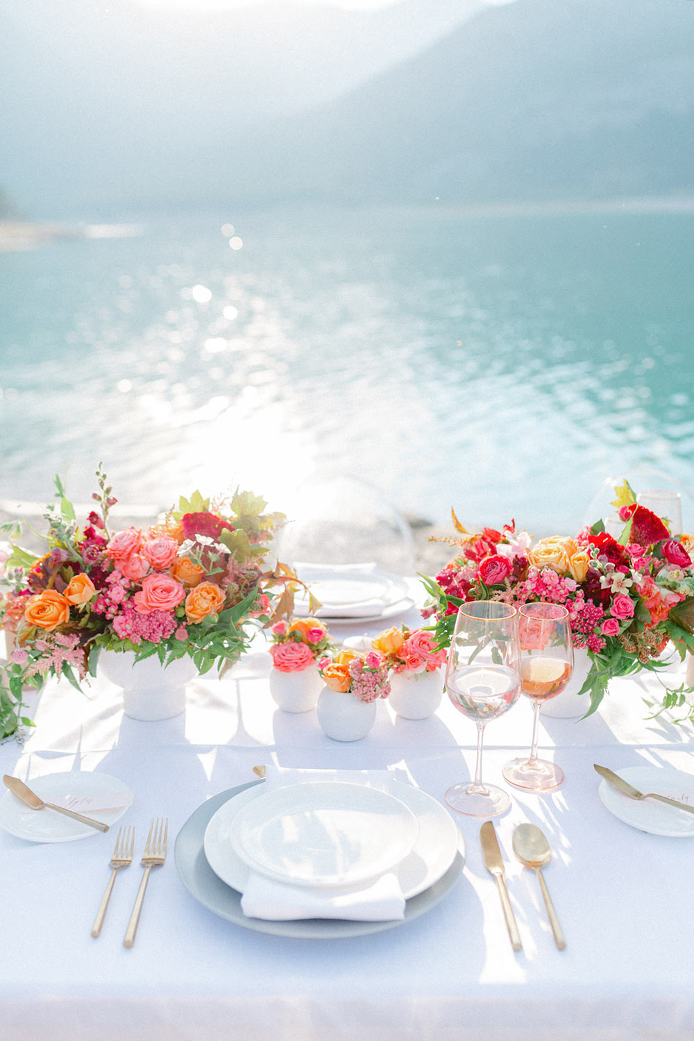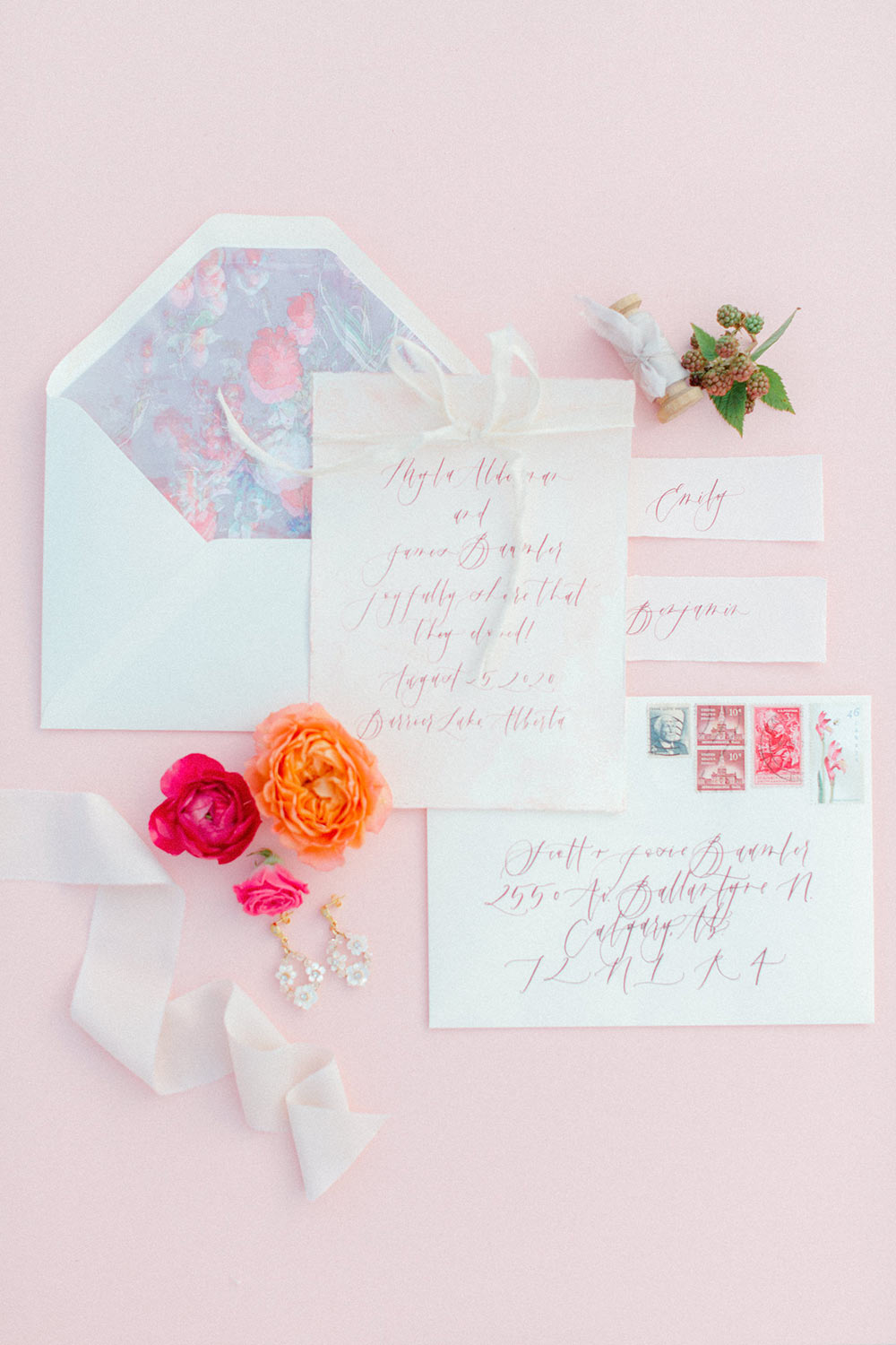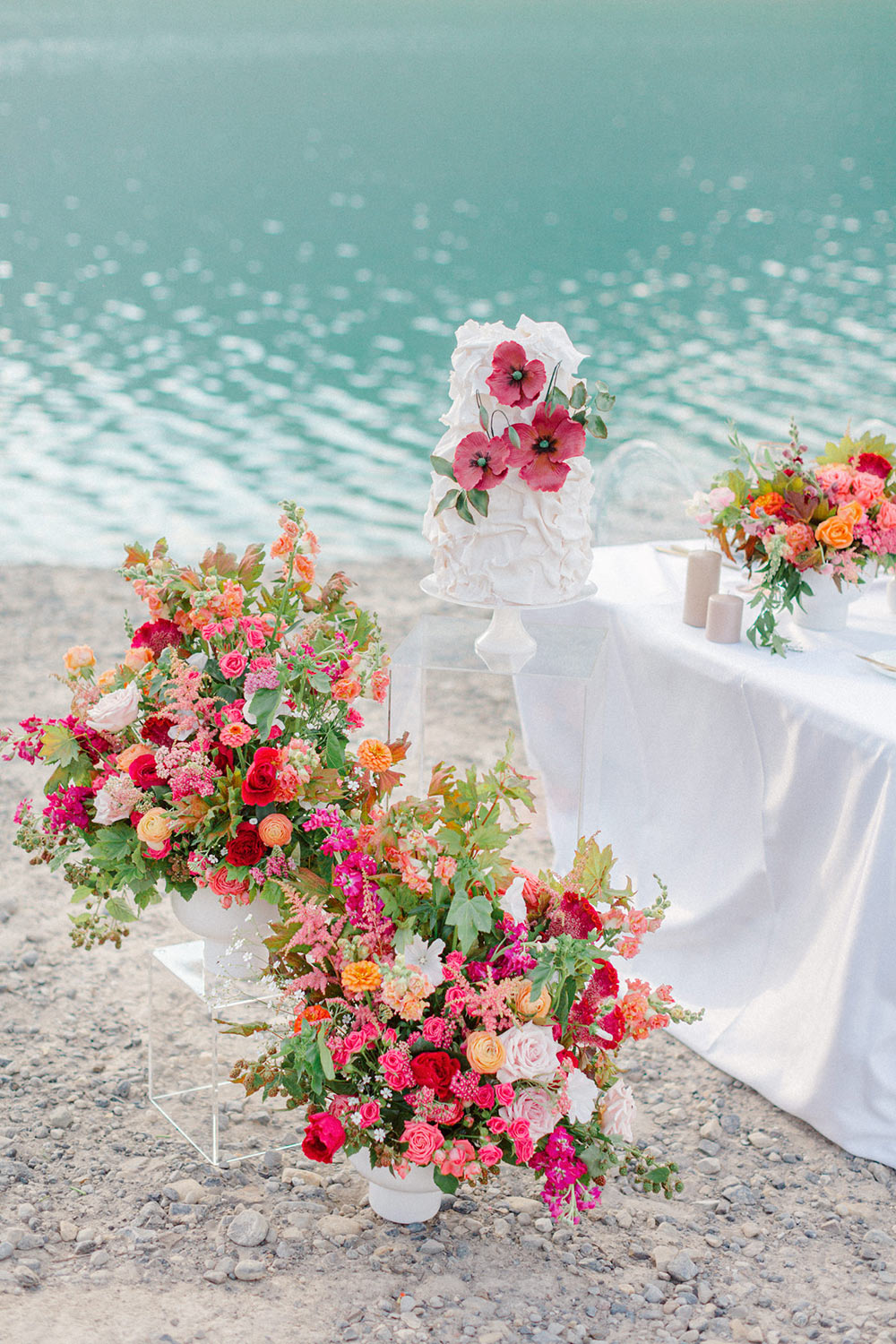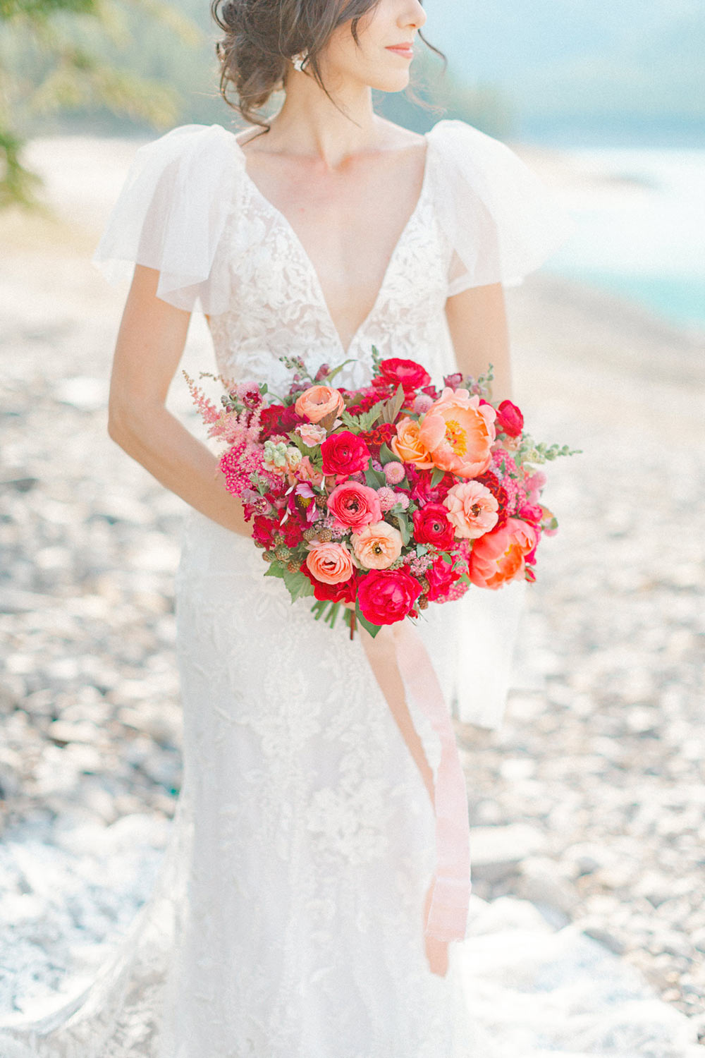 With so many weddings being significantly downsized this year this team wanted to showcase a slice of the Canadian Rocky Mountains that is often missed out on! Kananaskis is slightly southeast of Banff National Park with one of the most unique lakes in the area with sand surrounding the water edge. To celebrate love during such a tough season they opted for an incredibly bright color palette full of the happiest colors like coral, raspberry and peach. They wanted to create a feeling of a destination elopement in their own backyard of the Rocky Mountains.