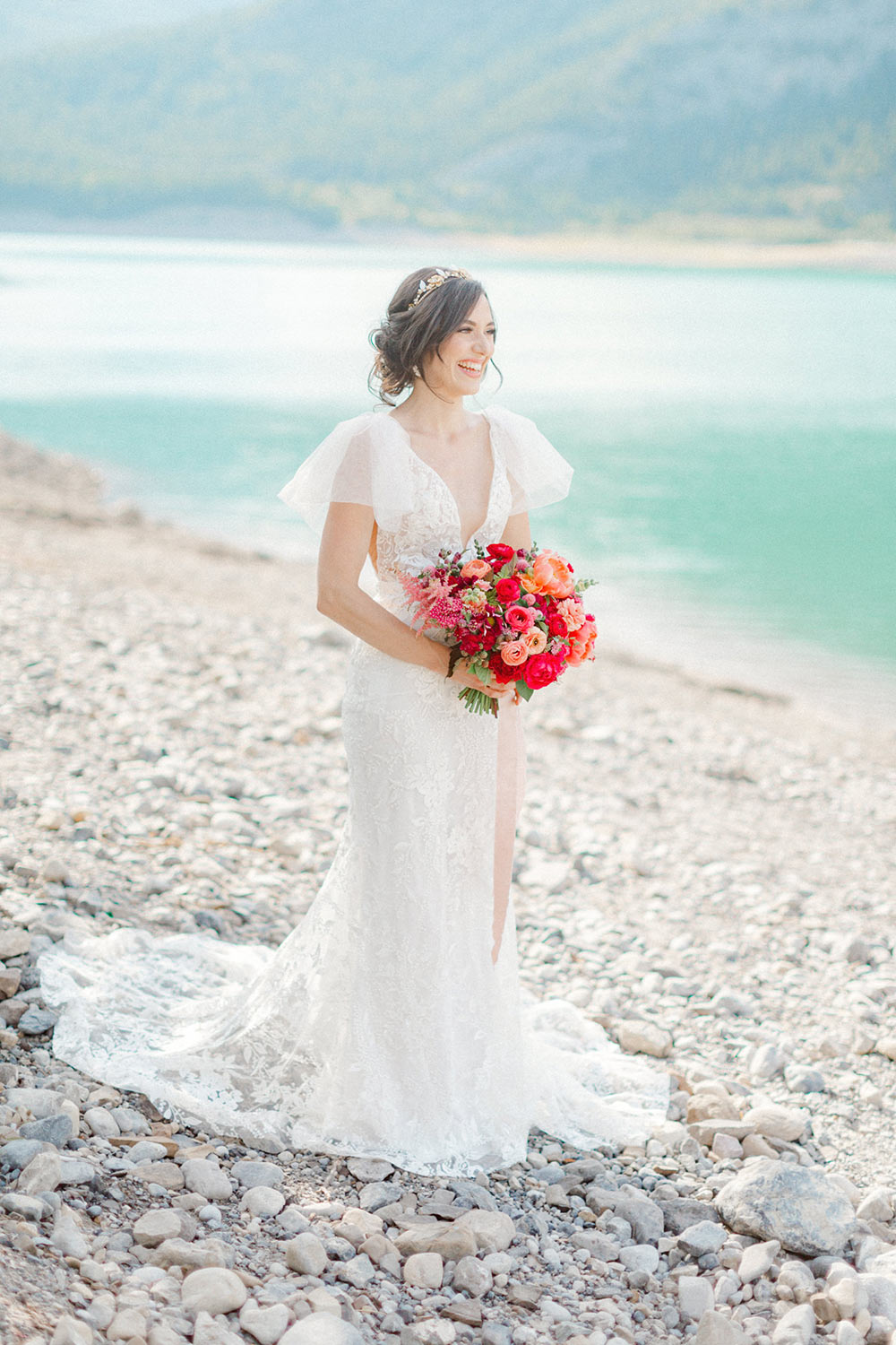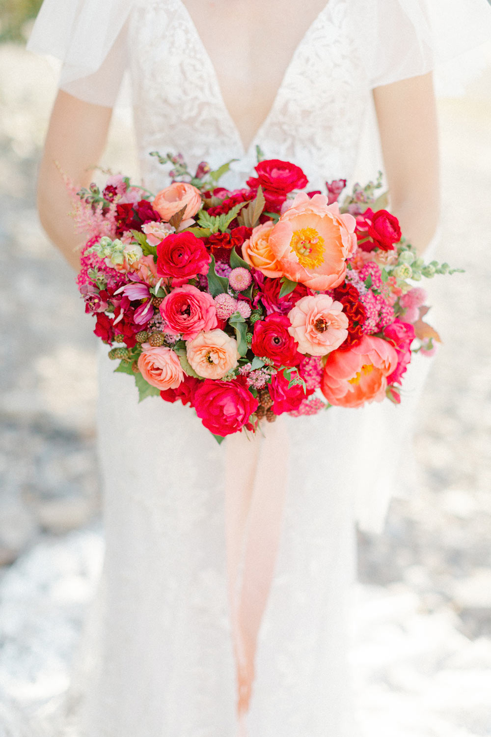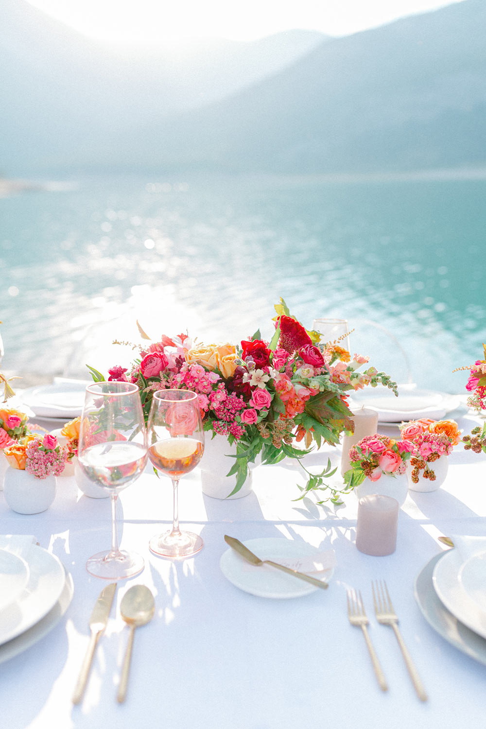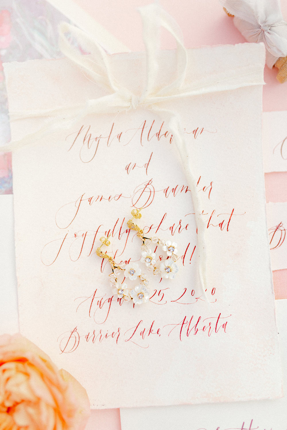 With so many weddings being significantly downsized this year this team wanted to showcase a slice of the Canadian Rocky Mountains that is often missed out on! Kananaskis is slightly southeast of Banff National Park with one of the most unique lakes in the area with sand surrounding the water edge. To celebrate love during such a tough season they opted for an incredibly bright color palette full of the happiest colors like coral, raspberry and peach. They wanted to create a feeling of a destination elopement in their own backyard of the Rocky Mountains.