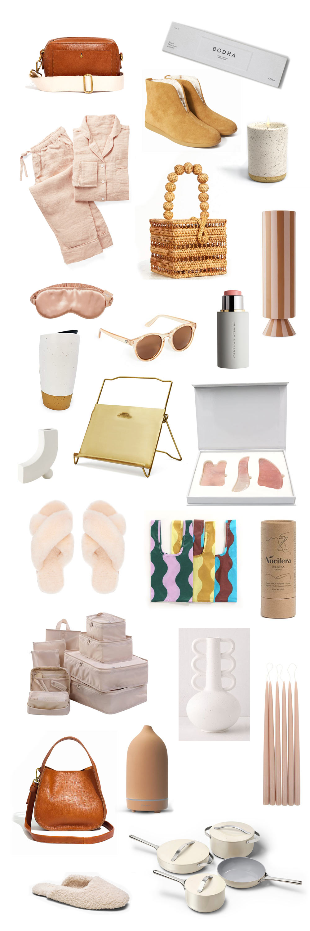 Leather Transport Bag | Bodha incense | Shearling boots | Norden Ojai candle | Linen pajamas | Satin eye mask | Rattan box bag | Striped vase | Baby Cheeks blush stick | Sunglasses | Ceramic travel mug | Brass cookbook stand | Rose quartz Gua Sha tools | Ceramic arc vase | Sheepskin slipper slide | Baggu mini bag set | Nucifera natural moisturizing stick | Travel packing cubes | Sculptural boho vase | 18-inch colored taper candles | Vitruvi stone oil diffuser | Luxe leather crossbody bag | Caraway ceramic cookware set | Sherpa slipper