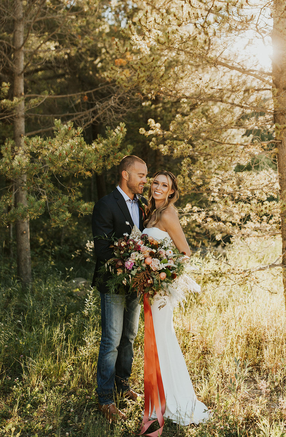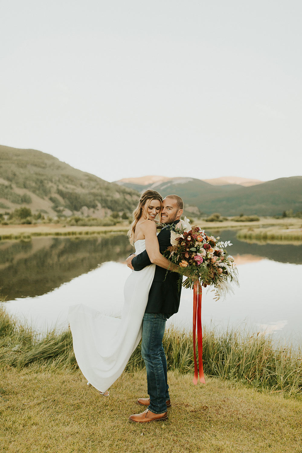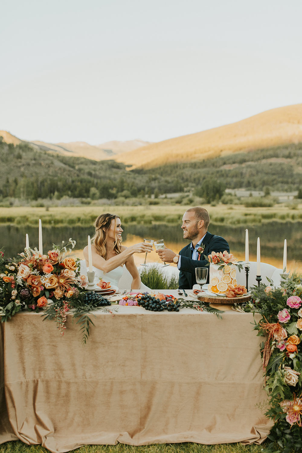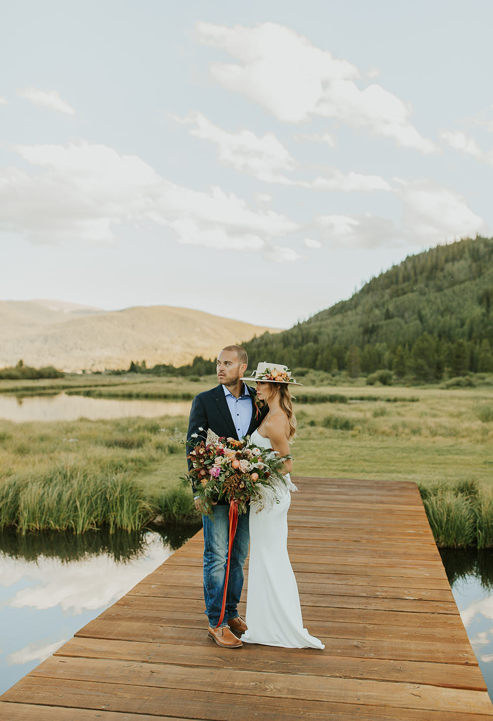 Photography: For the West and Wild | Planning and Design: Erika Sandoval Events | Venue: Camp Hale Weddings | Floral Design: Inspired Designs Floral and Event Design | Stationer: Tasha Rae Designs | Linen and Chargers: BBJ Linen | Hair and Makeup: cKaceeGo Kacee Picot | Cake: Ruby Jean Patisserie | Charcuterie Board: The Grazing Fox | Rentals and Tabletop Decor: Hazel Grove Rentals & Design | Dress: Revolve | Grooms Coat: Armani | Jewelry: Sarah O. Jewelry | Ring Box: The Mrs. Box | Solitaire ring and gold wedding band: Family Heirlooms | Bride and Groom: Danielle and Drake McCulloch